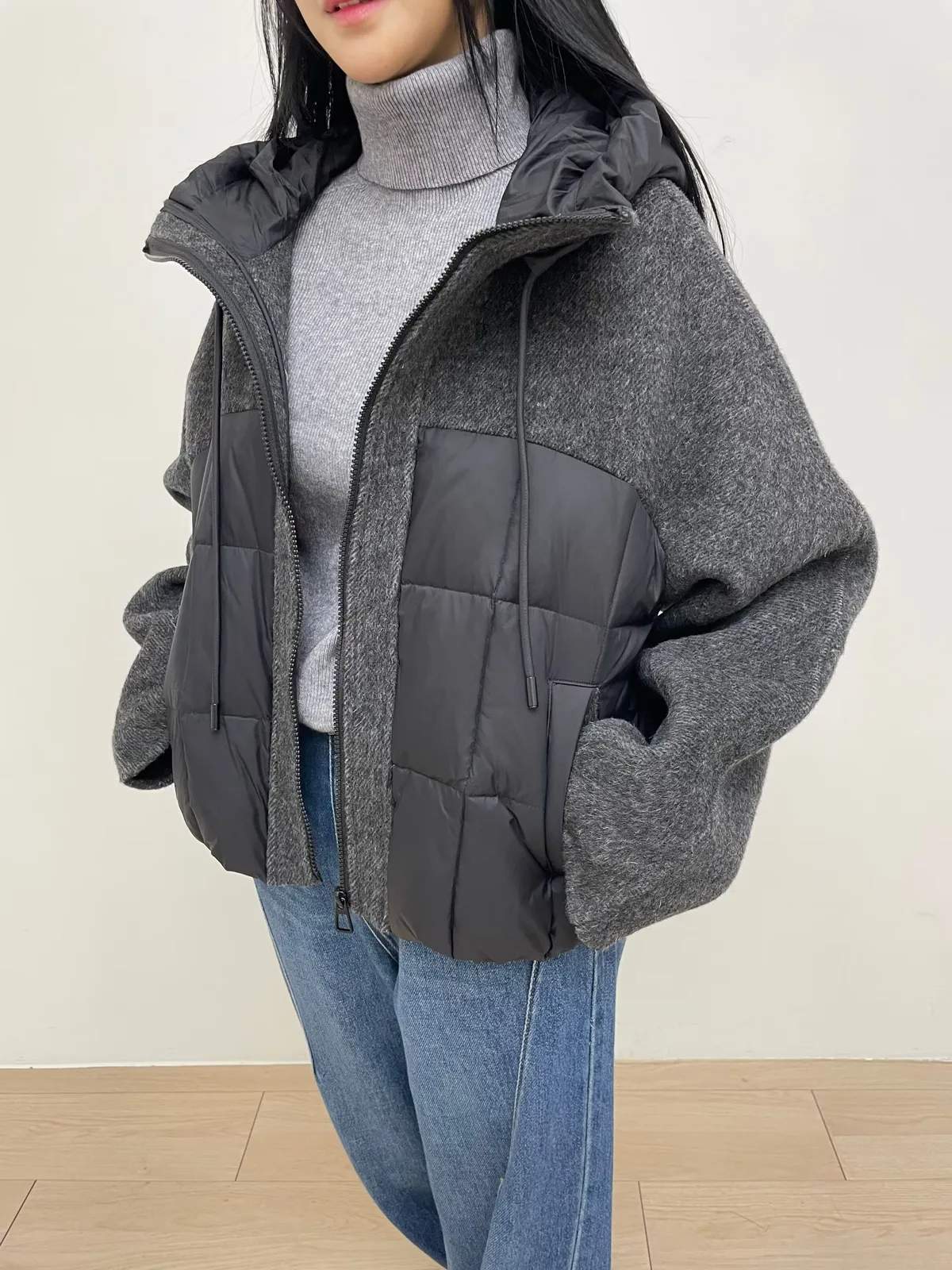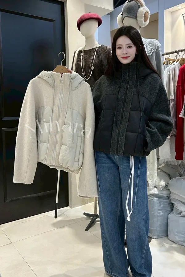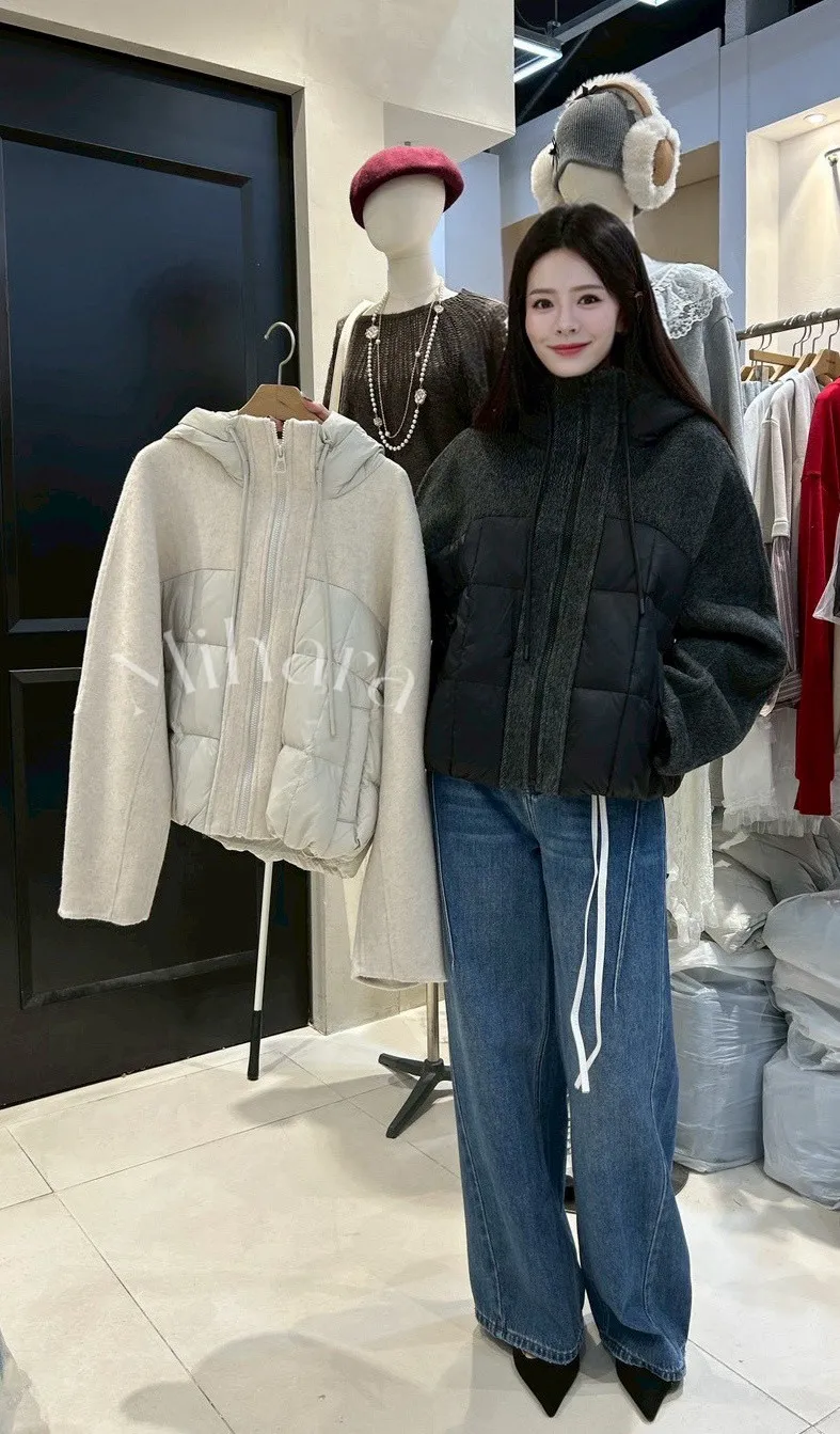A27 0201設計家拼接鴨絨連帽手工羊毛大衣外套2色