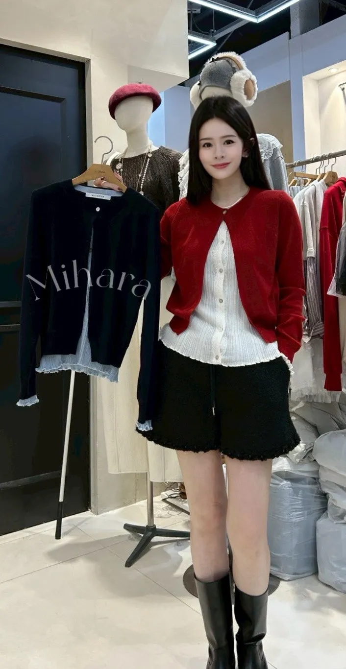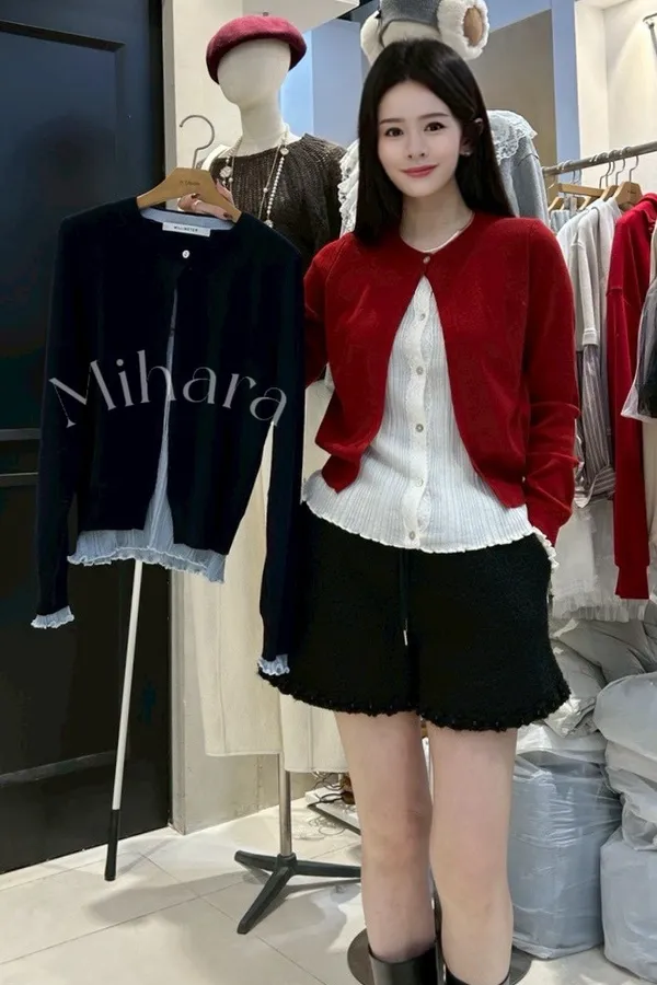 A33 0201設計家假兩件式撞色圓領蕾絲針織上衣2色