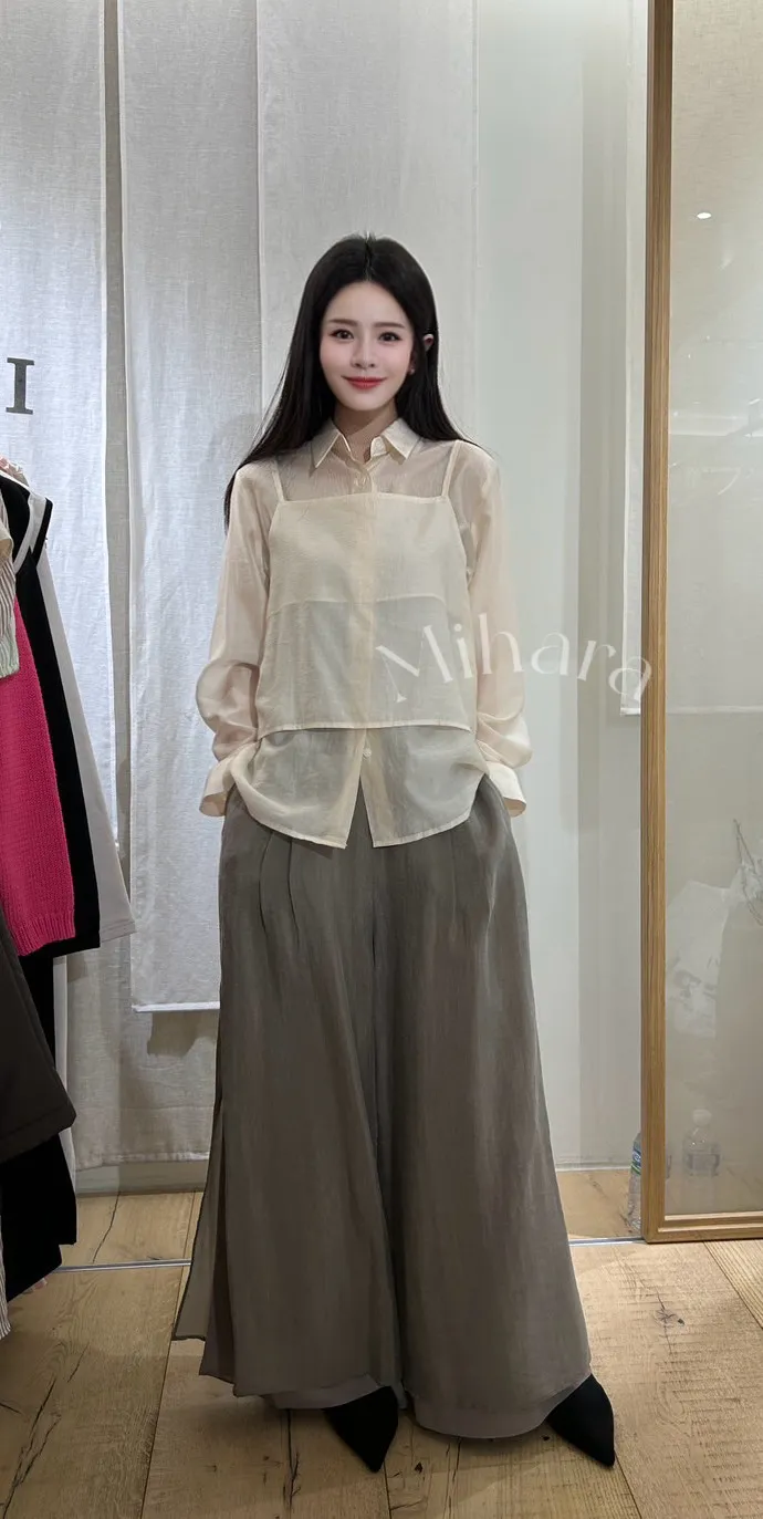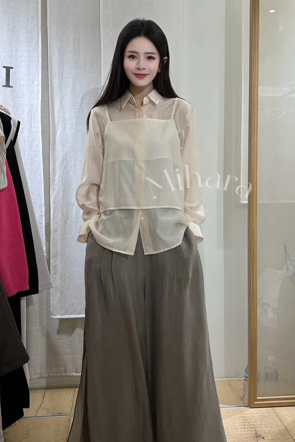 A42 0202(限量特)氣質歐膩家後綁帶細肩帶平口天絲背心+天絲襯衫(SET)