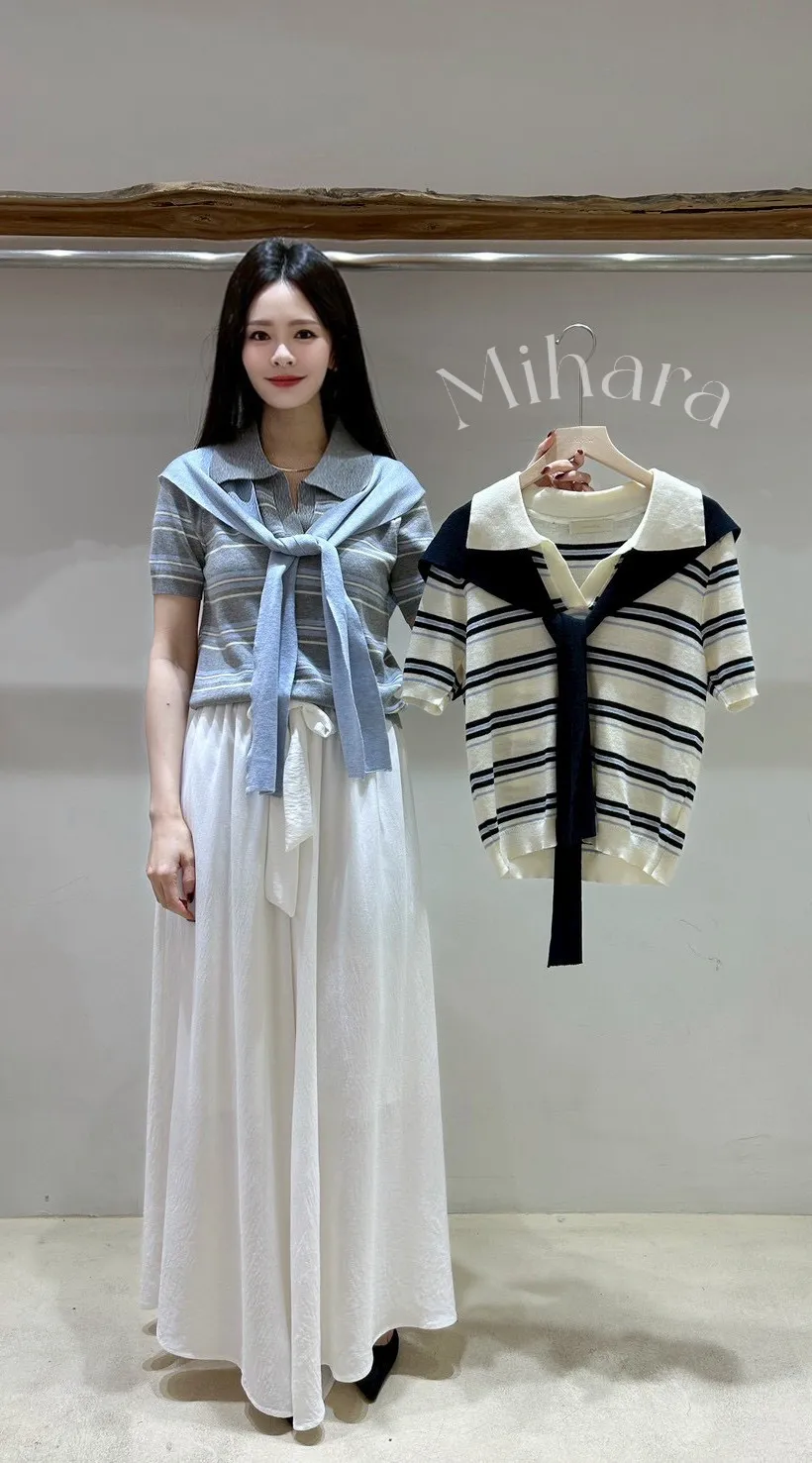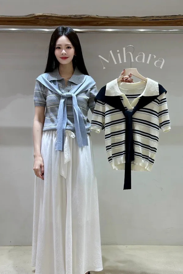 A24 0204甜甜CP家橫條針織POLO衫附披肩2色