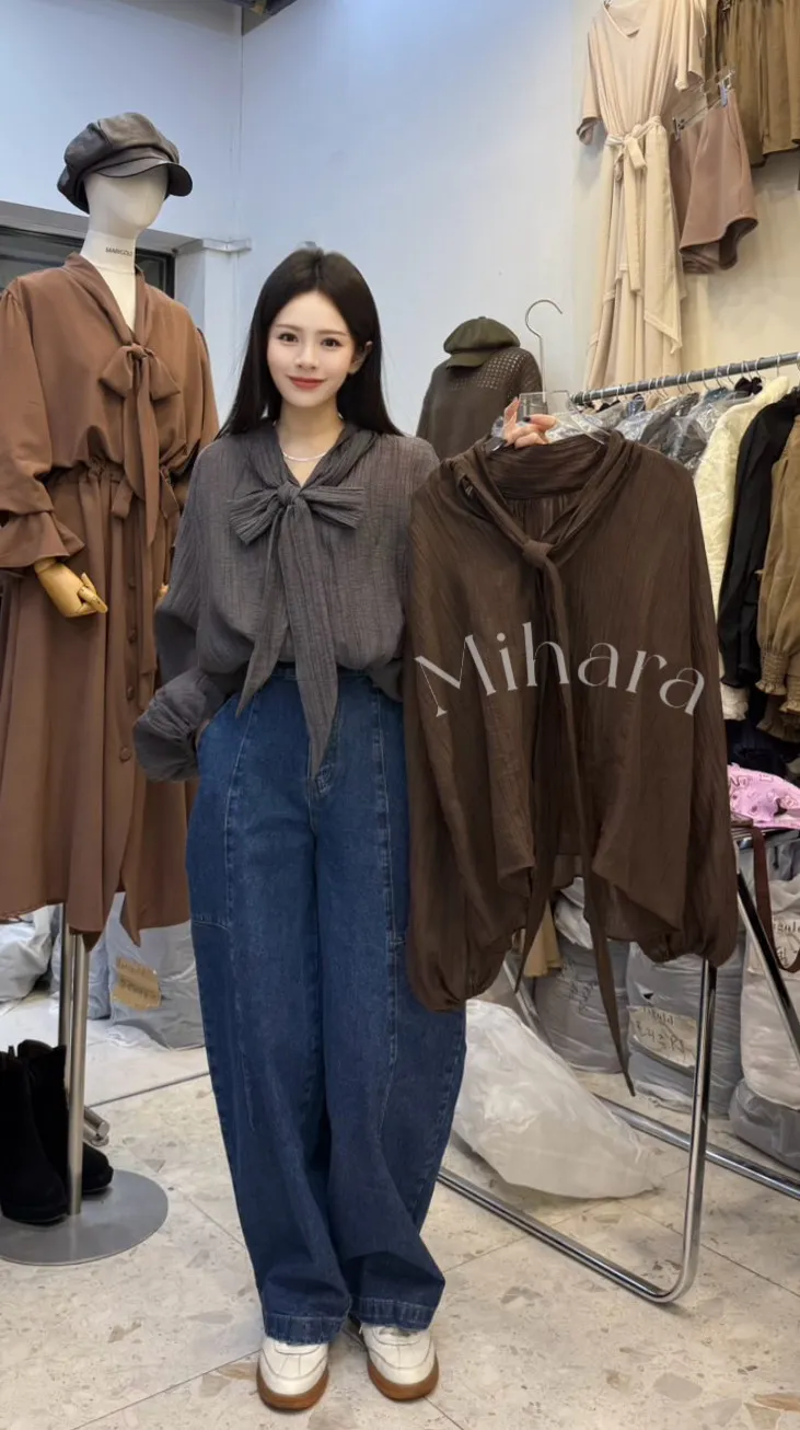 A49 0205(限量特)設計家大蝴蝶結綁帶V領雪紡襯衫2色