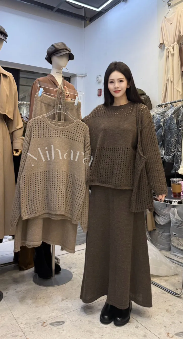 A54 0205(限量特)設計家圓領洞洞針織罩衫+針織半裙+針織大包包(SET)2色