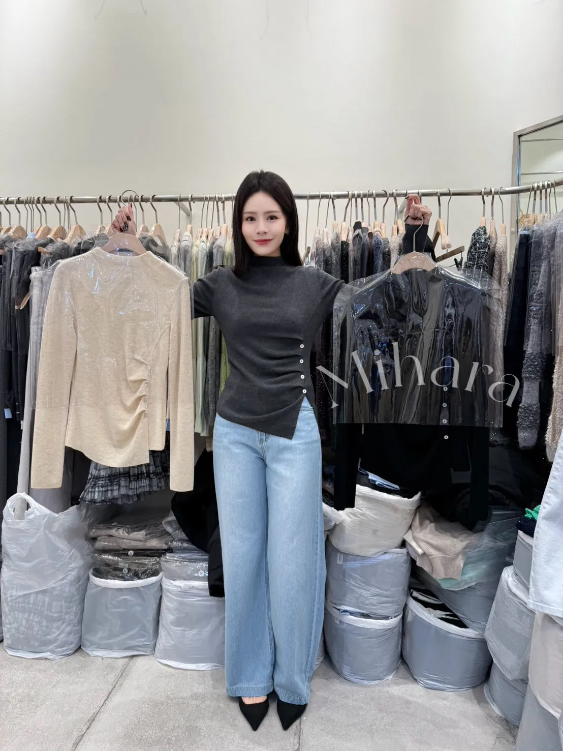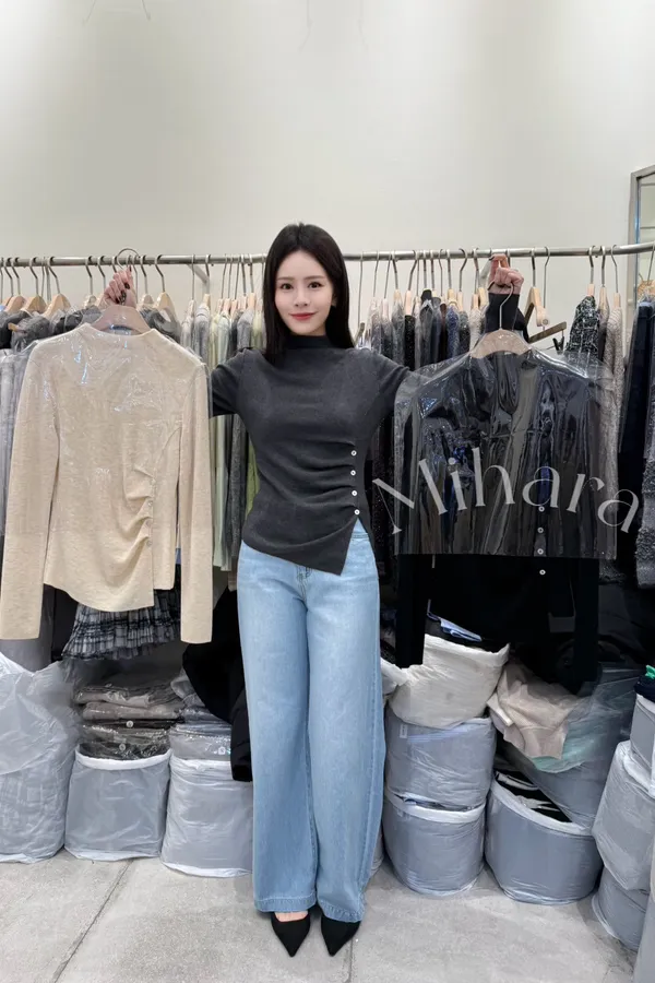 A63 0205Love針織家側開衩排釦抓褶半領上衣3色