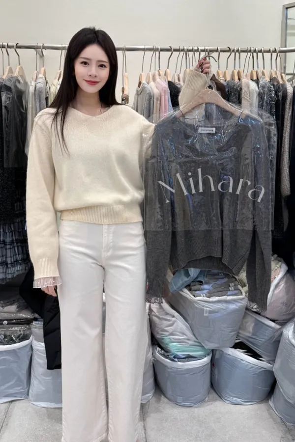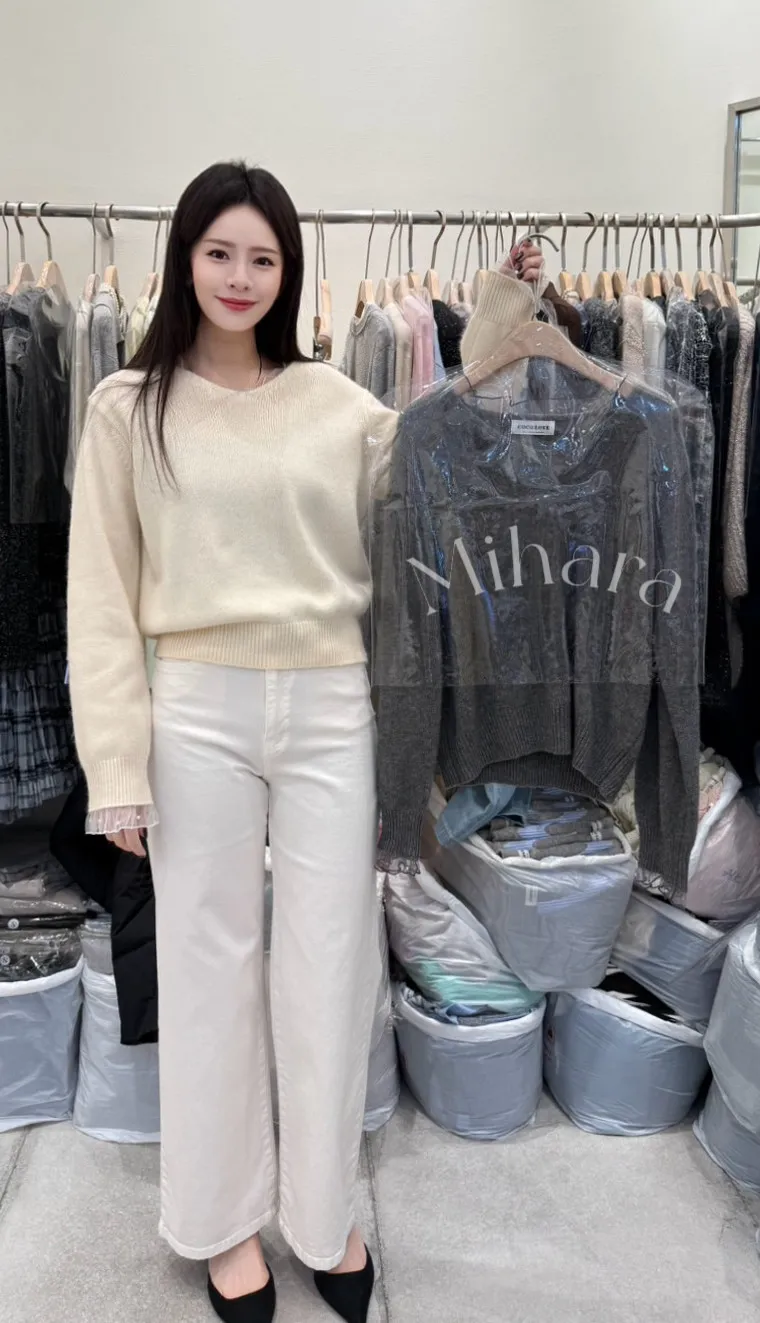 A73 0205(限量特)Love針織家拼接珍珠網紗圓領針織毛衣2色