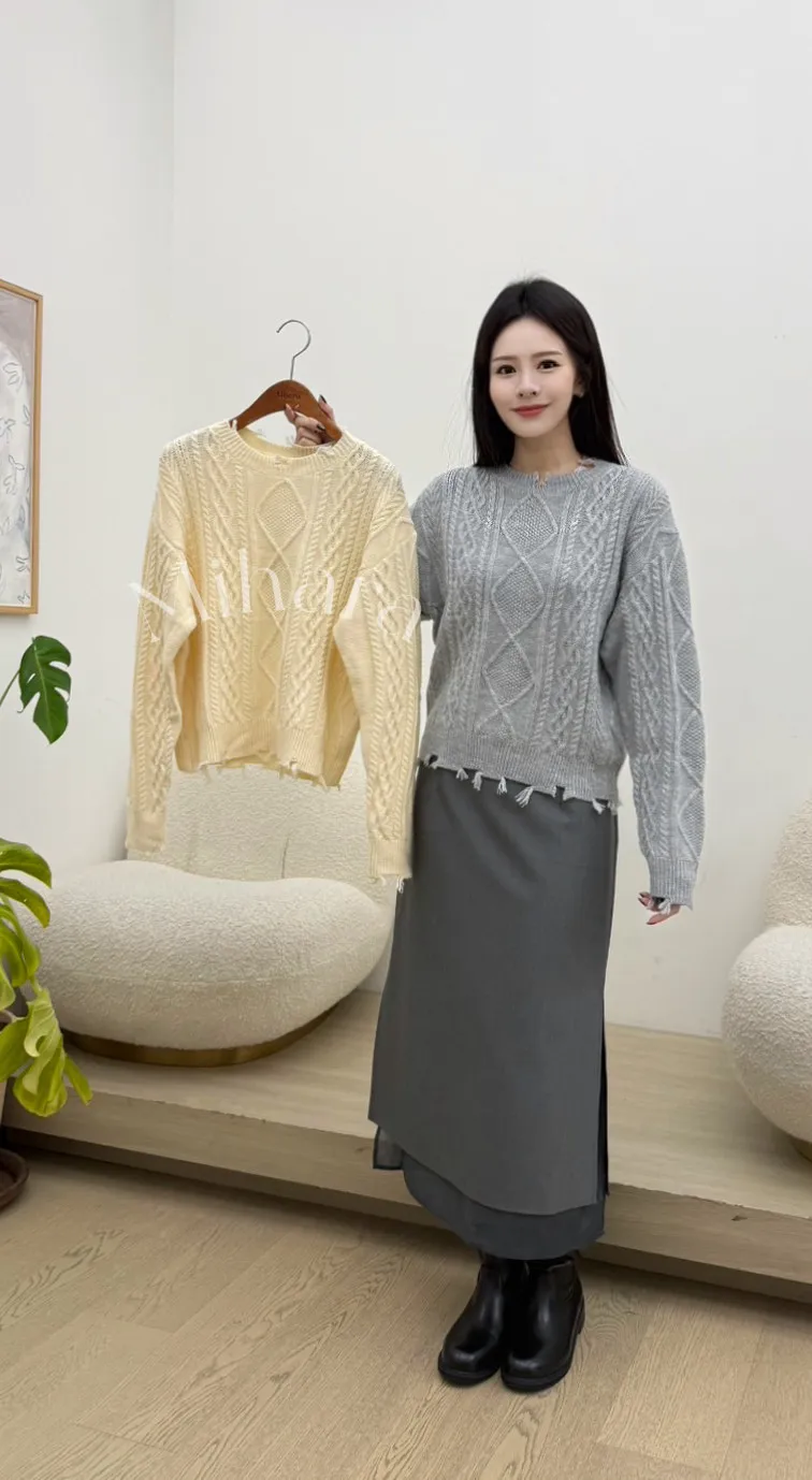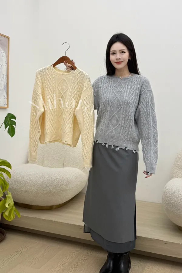 A15 0209(限量特)高檔設計家流蘇菱格麻花編圓領針織毛衣2色