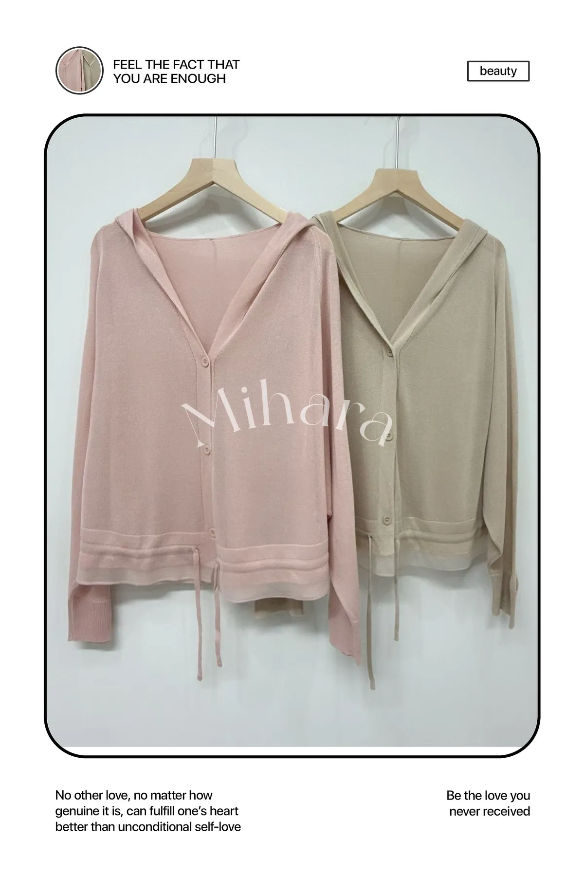 A38 0223CP甜甜家拼接網紗蕾絲下擺V領連帽針織衫2色
