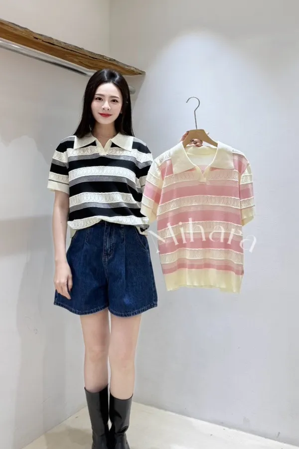 A40 0223CP甜甜家寬橫條簍空針織POLO衫2色