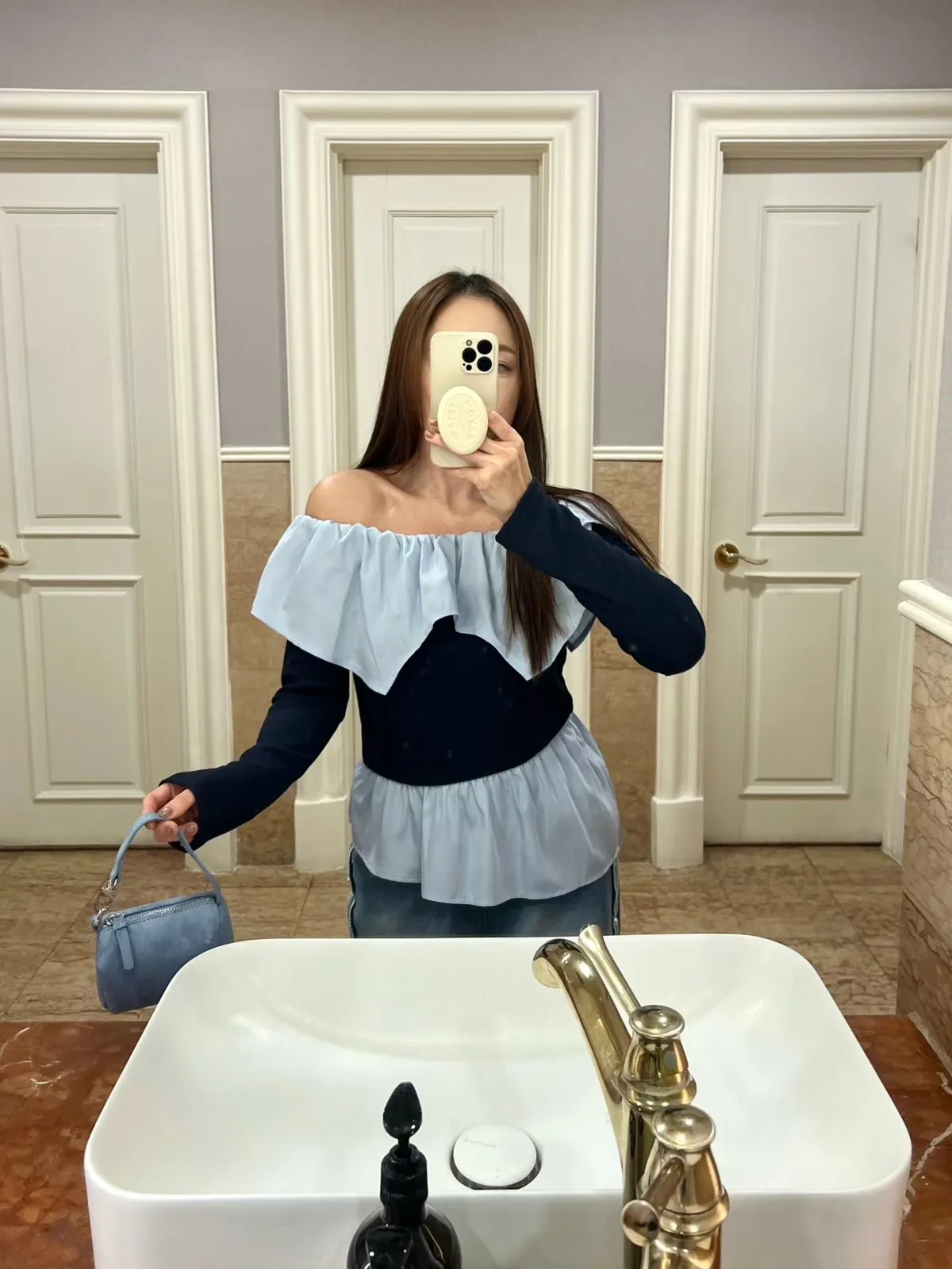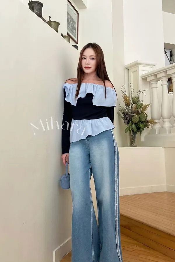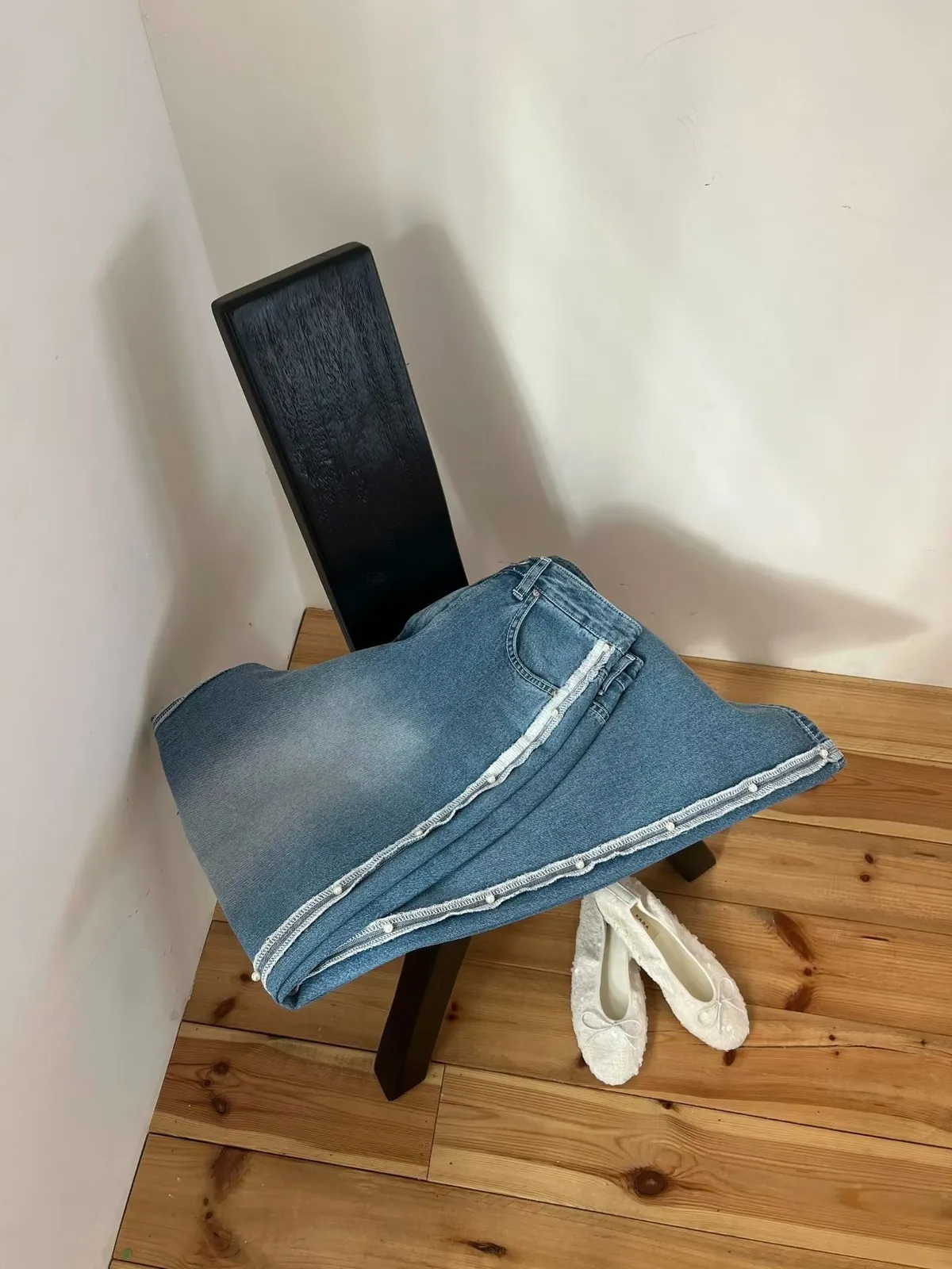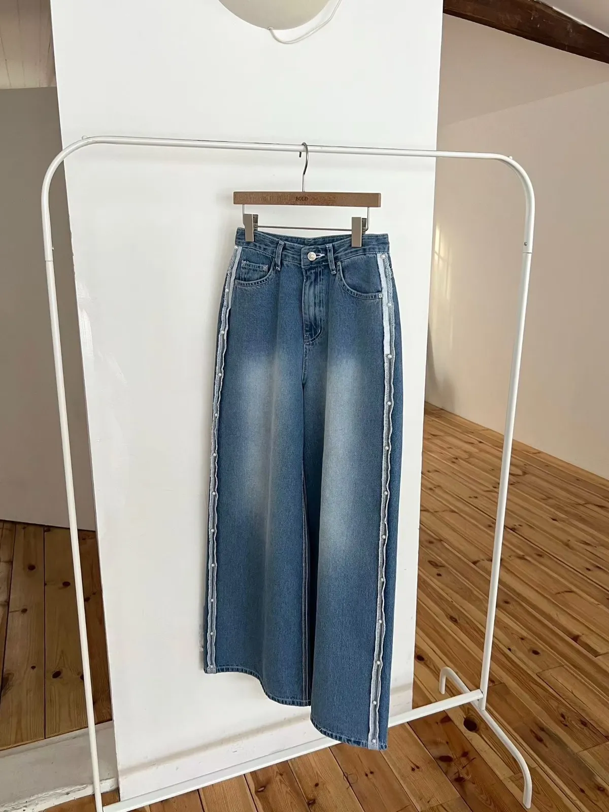 A52 0224設計家拼接珍珠直筒寬牛仔褲(S/M/L)