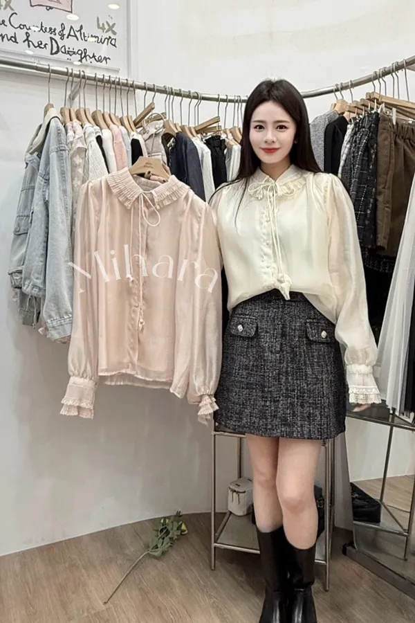 A64 0224雙胞胎歐膩家綁帶緞面襯衫2色