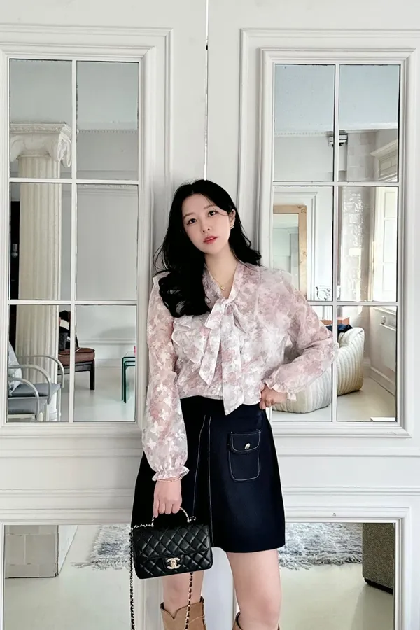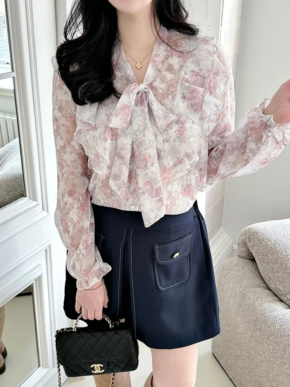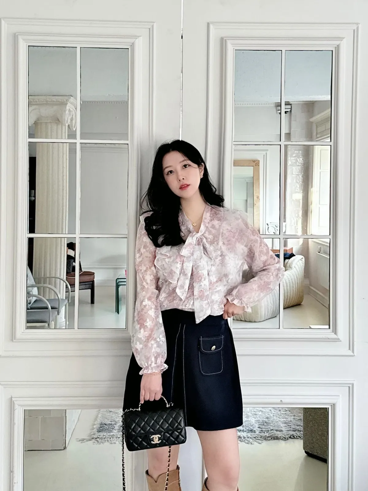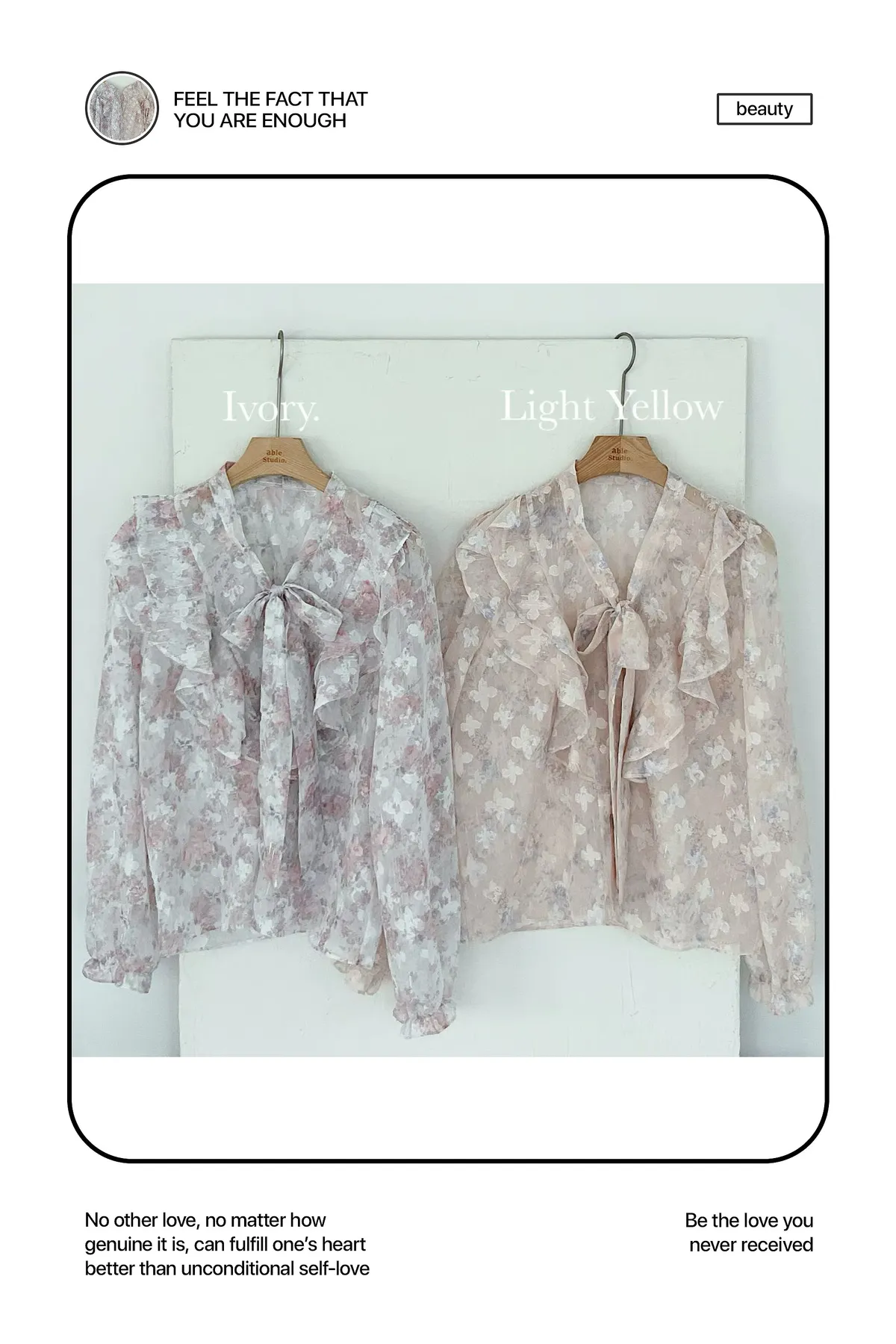 A67 0224雙胞胎歐膩家雙層荷葉邊綁帶碎花V領雪紡上衣2色