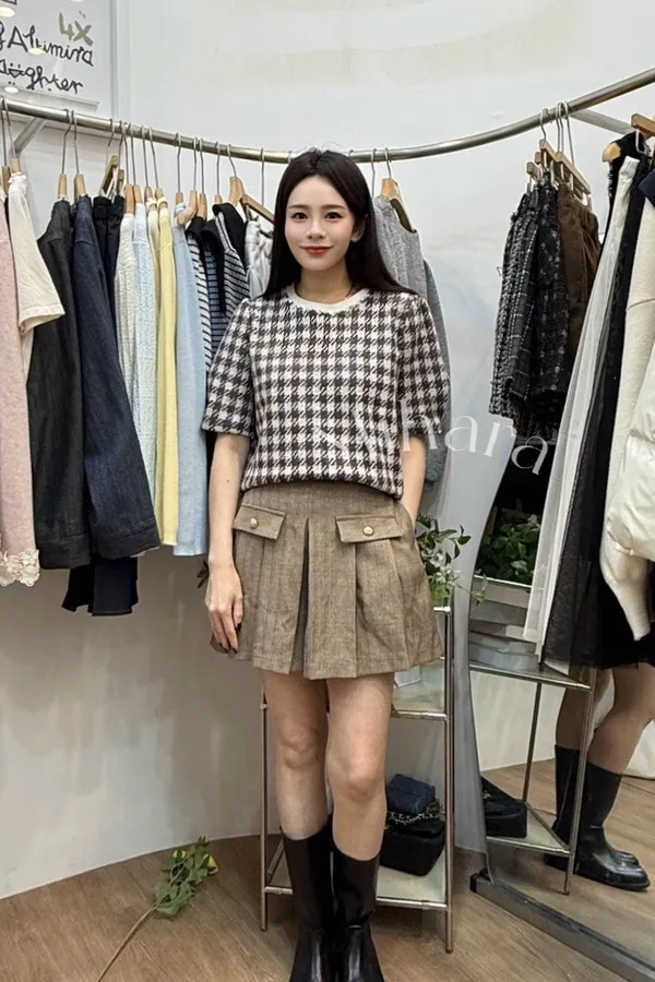 A82 0224(限量特)雙胞胎歐膩家拼接大小珍珠格紋圓領上衣