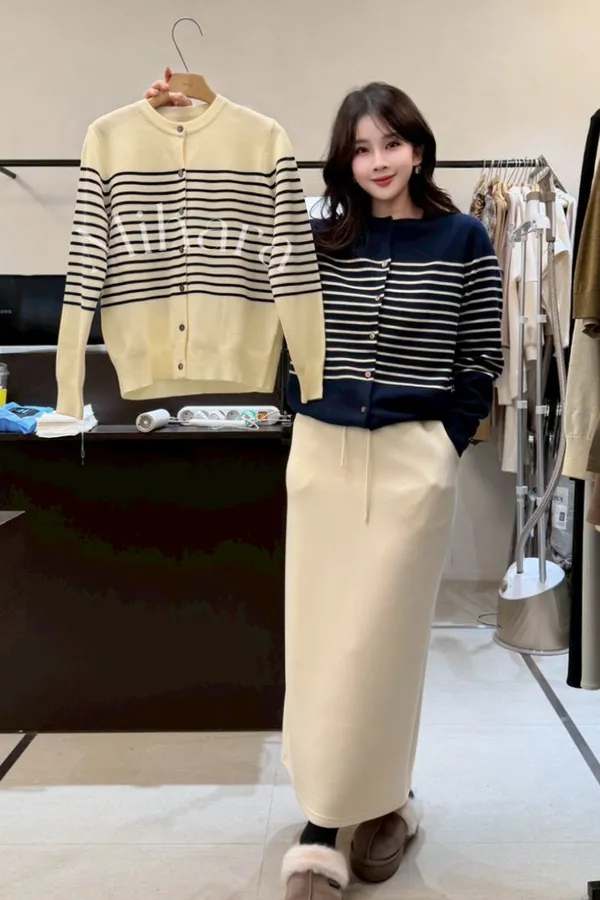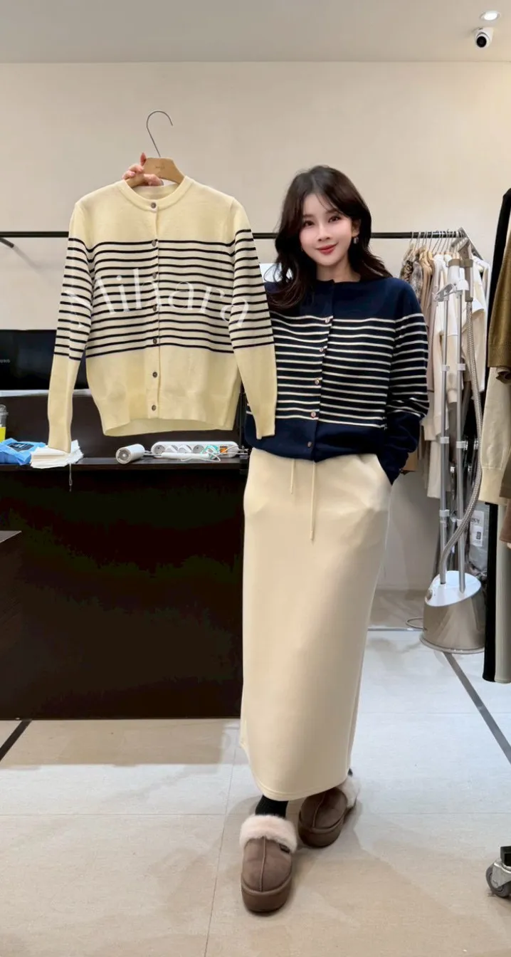 A7 0225高檔套裝家橫條圓領針織衫2色