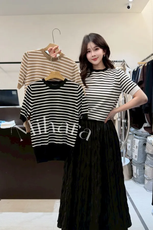A13 0225高檔套裝家橫條圓領針織T恤3色