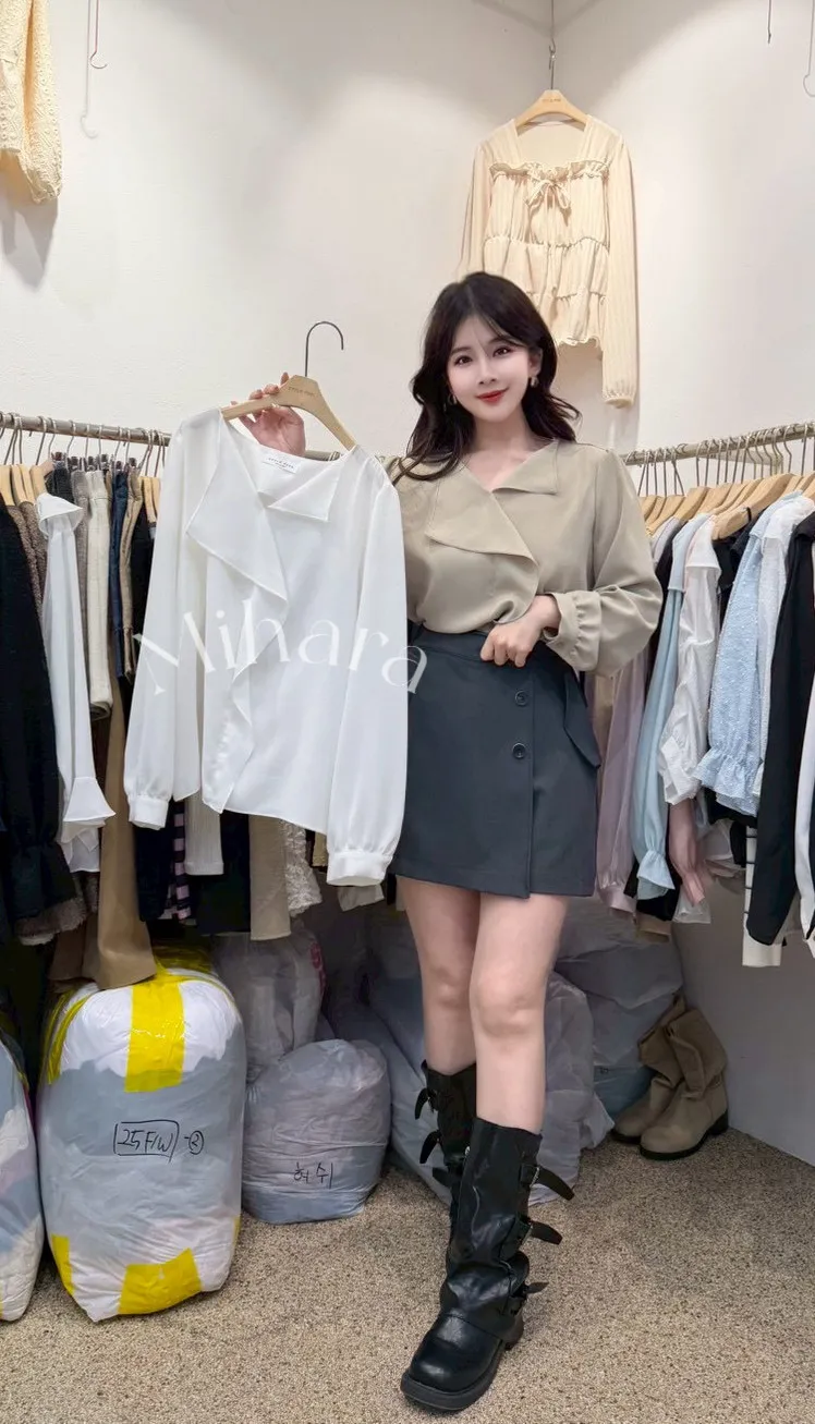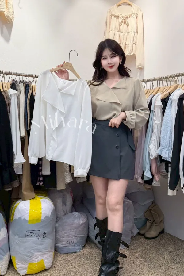 A37 0225(限量特)甜美OL家荷葉邊V領雪紡襯衫2色