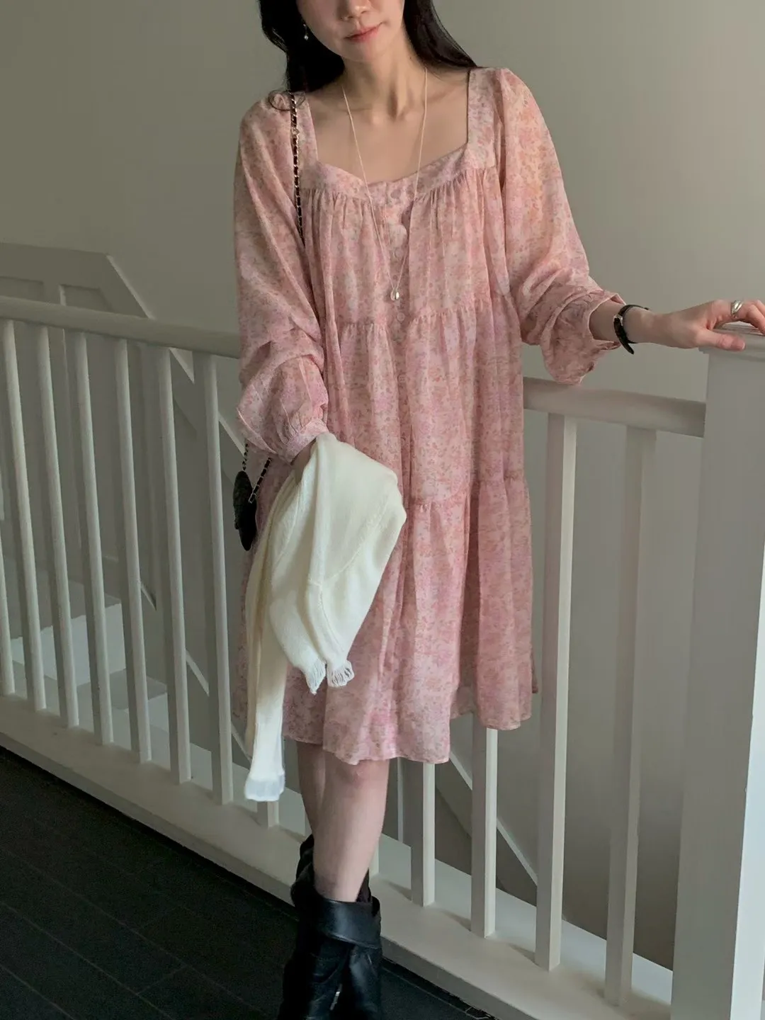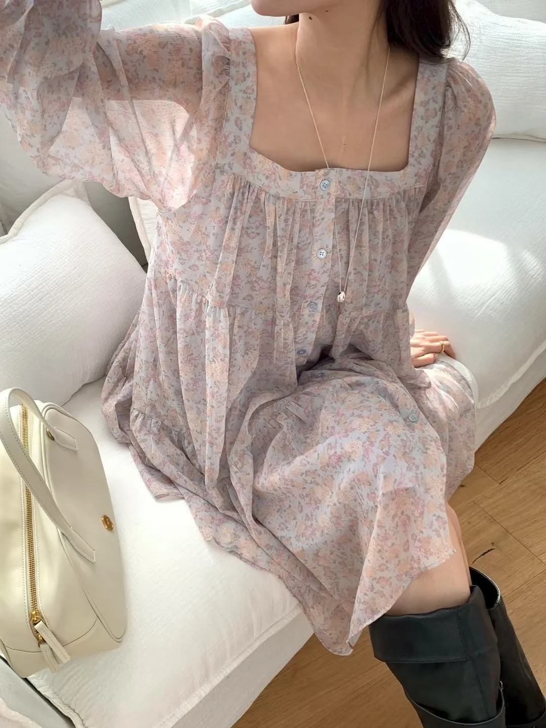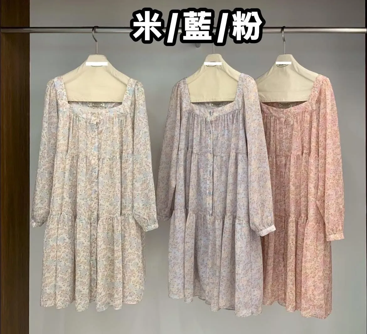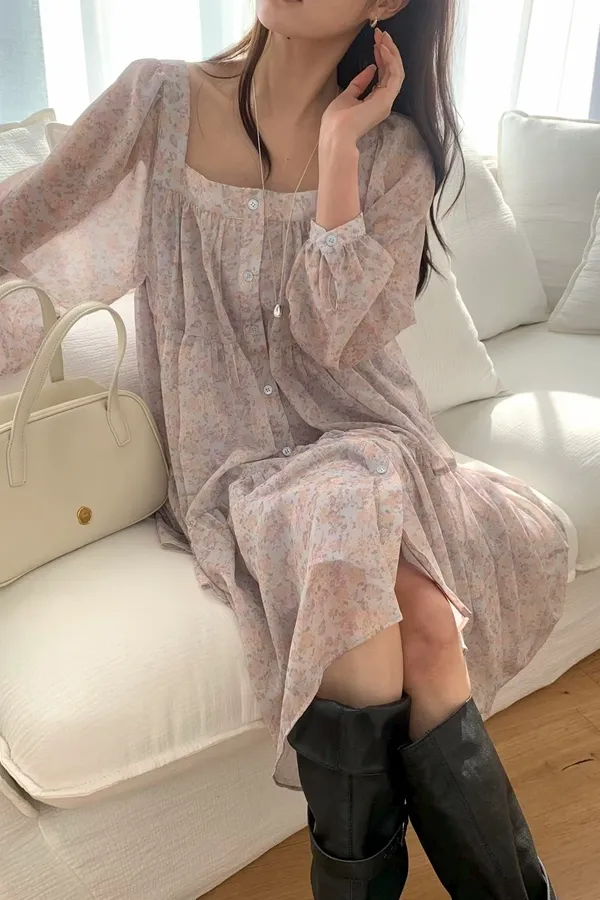 C215(限量特)高檔浪漫方領雪紡花洋裝3色