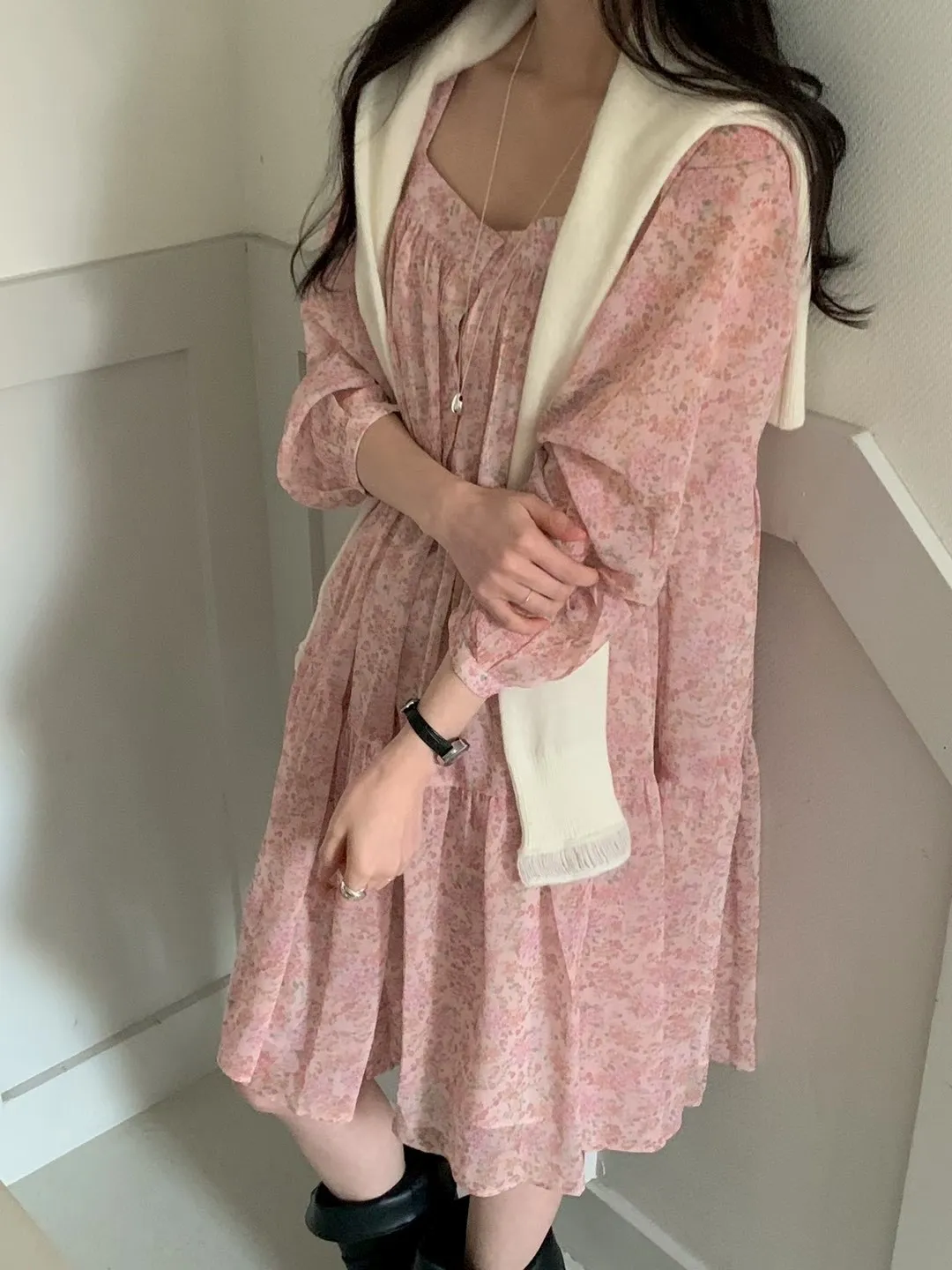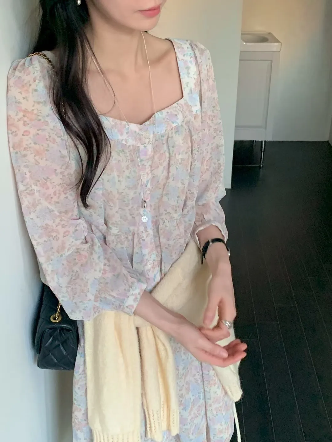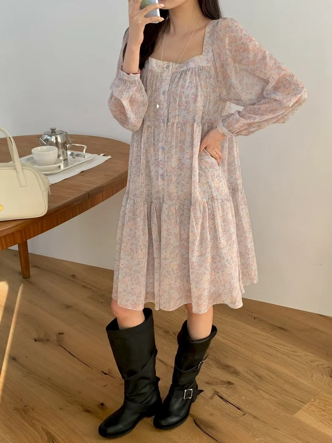 C215(限量特)高檔浪漫方領雪紡花洋裝3色