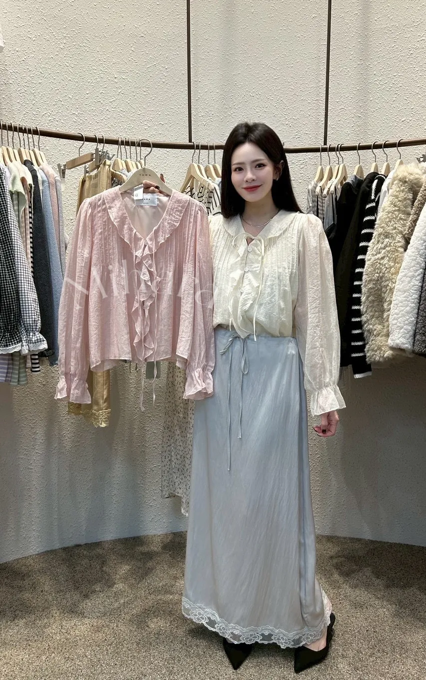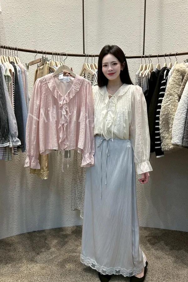 A31 0301CP新廠家荷葉邊綁帶V領雪紡上衣2色