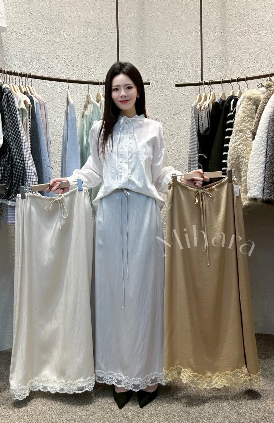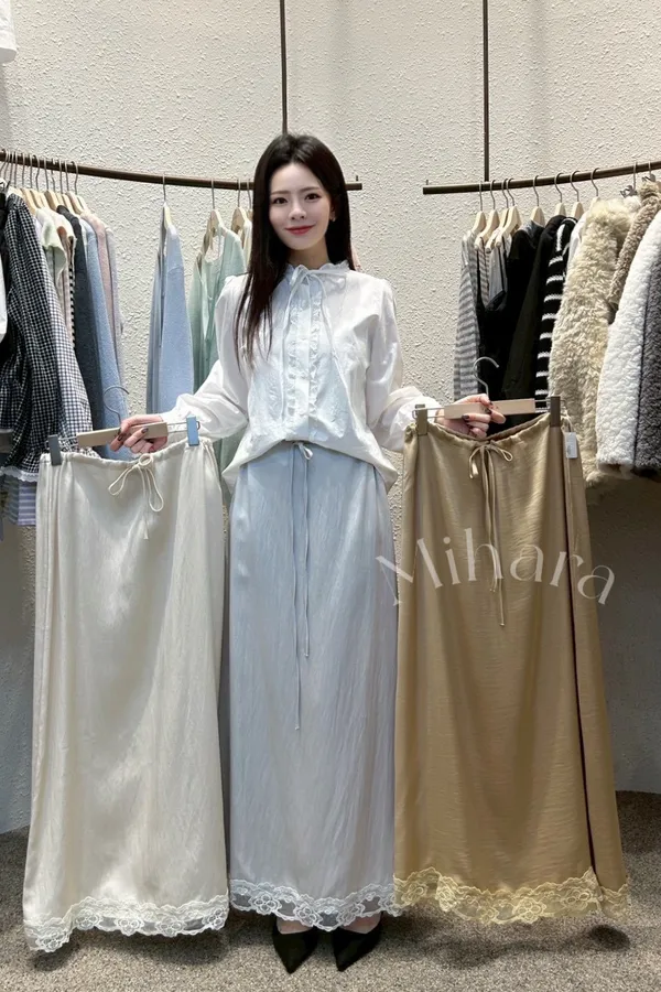 A33 0301CP新廠家蕾絲下擺光澤雪紡半裙3色