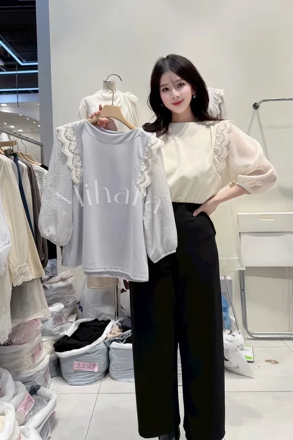 A13 0304CP蕾絲家拼接蕾絲帆船領上衣2色