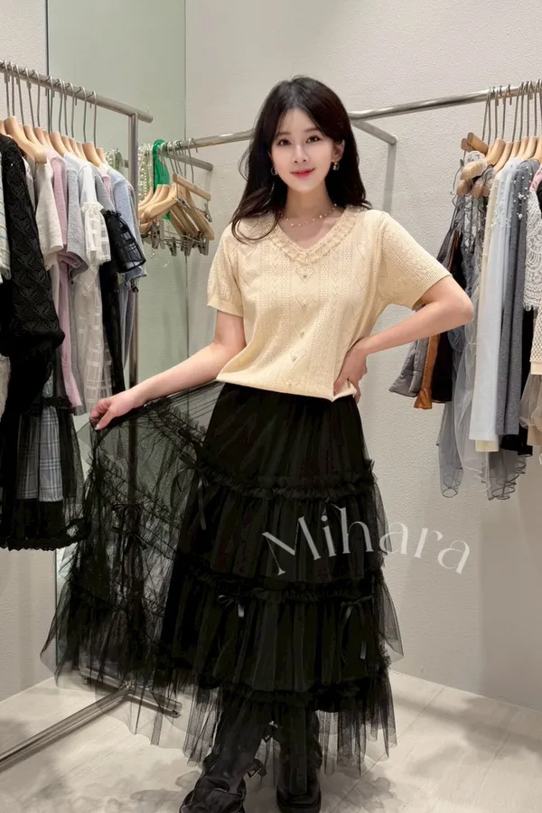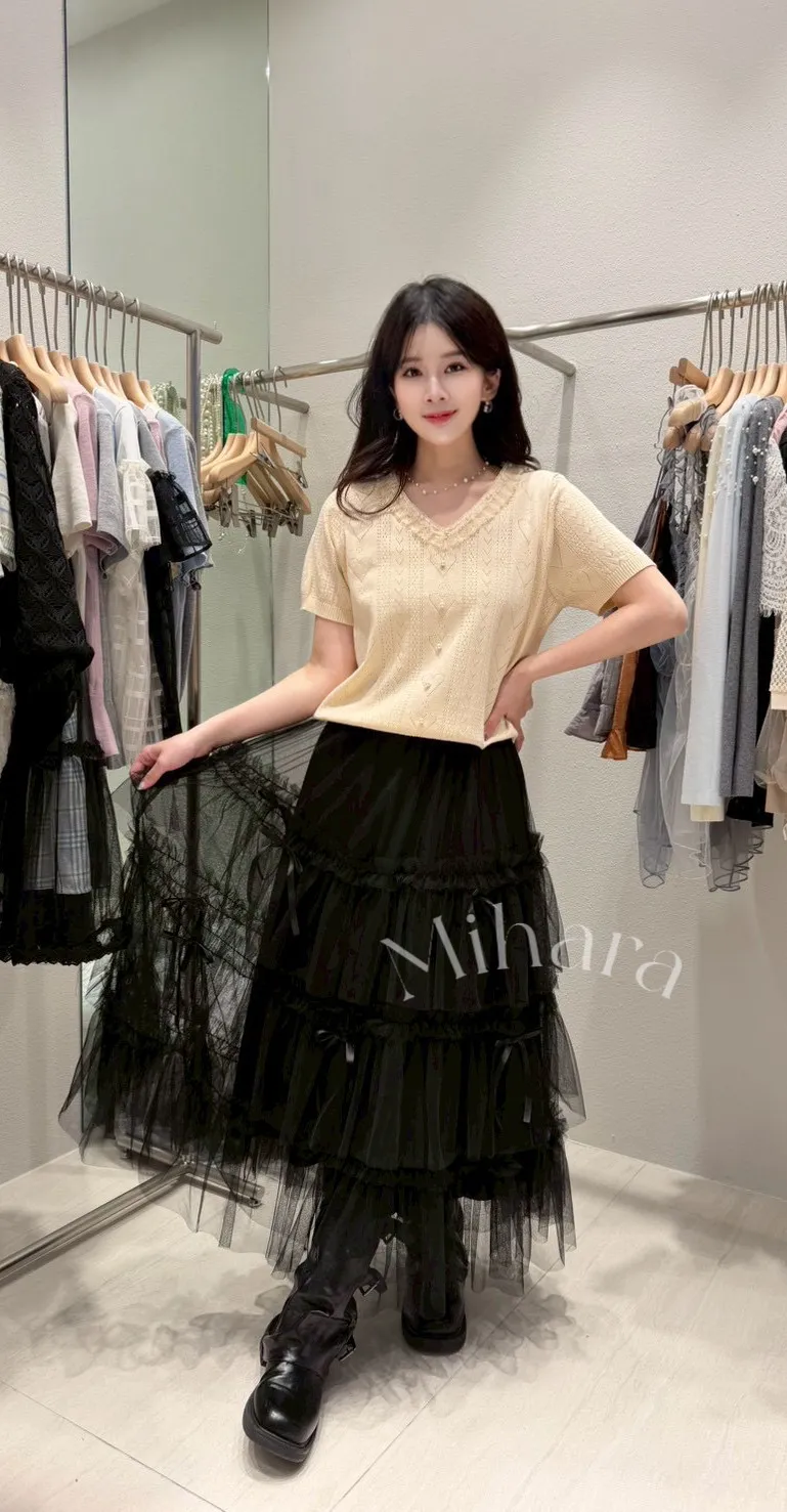 A34 0305CP小香家拼接蕾絲珍珠簍空愛心V領針織衫