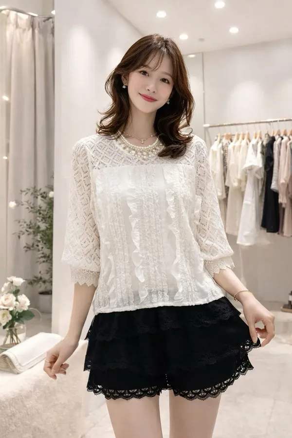 A41 0305CP小香家拼接波浪網紗簍空菱格圓領上衣2色