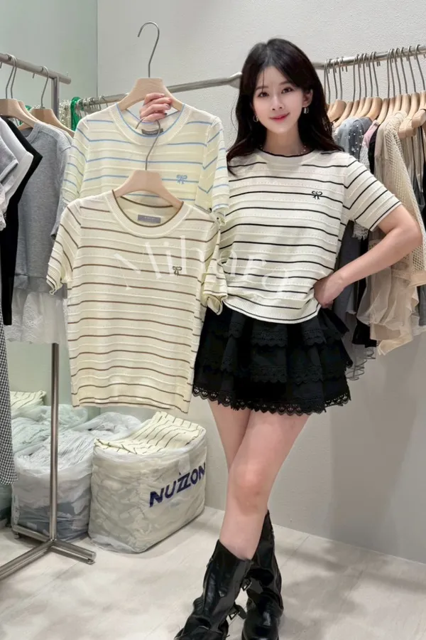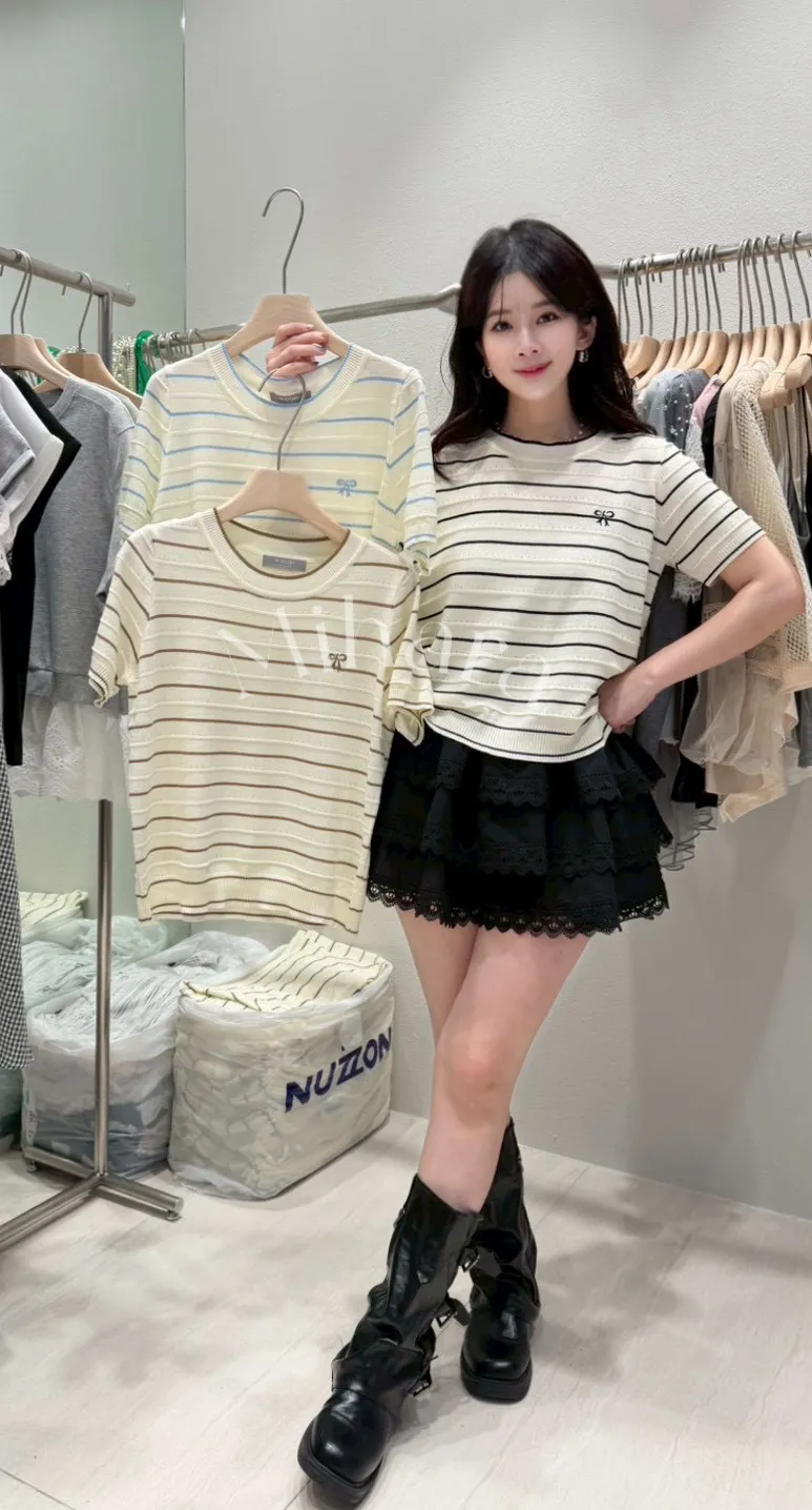 A42 0305CP小香家蝴蝶結橫條圓領針織衫3色