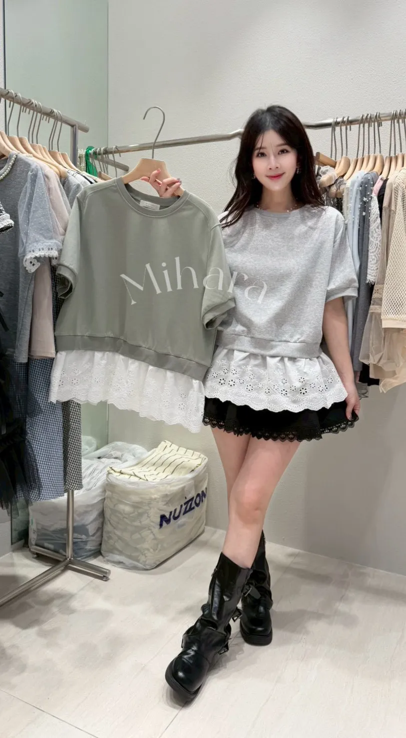A43 0305CP小香家拼接布蕾絲下擺圓領上衣2色