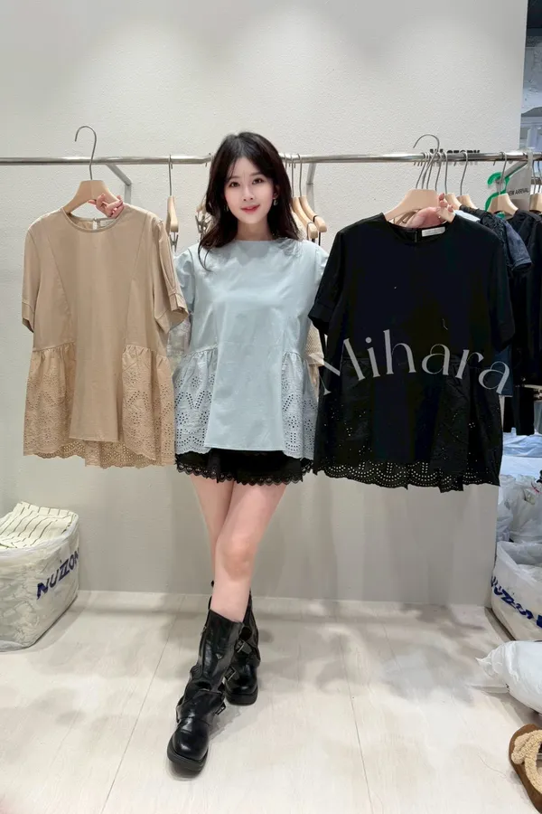 A44 0305CP小香家拼接蕾絲刺繡圓領娃娃上衣3色