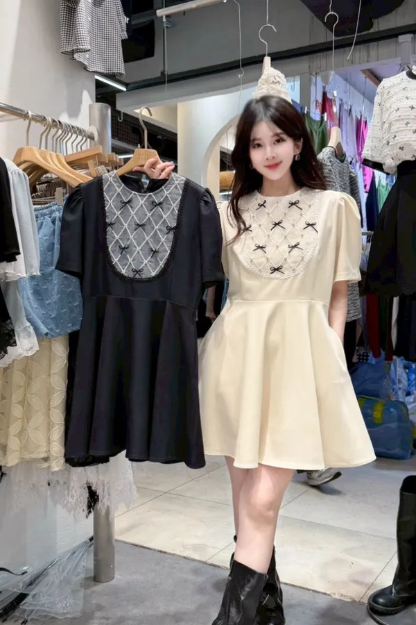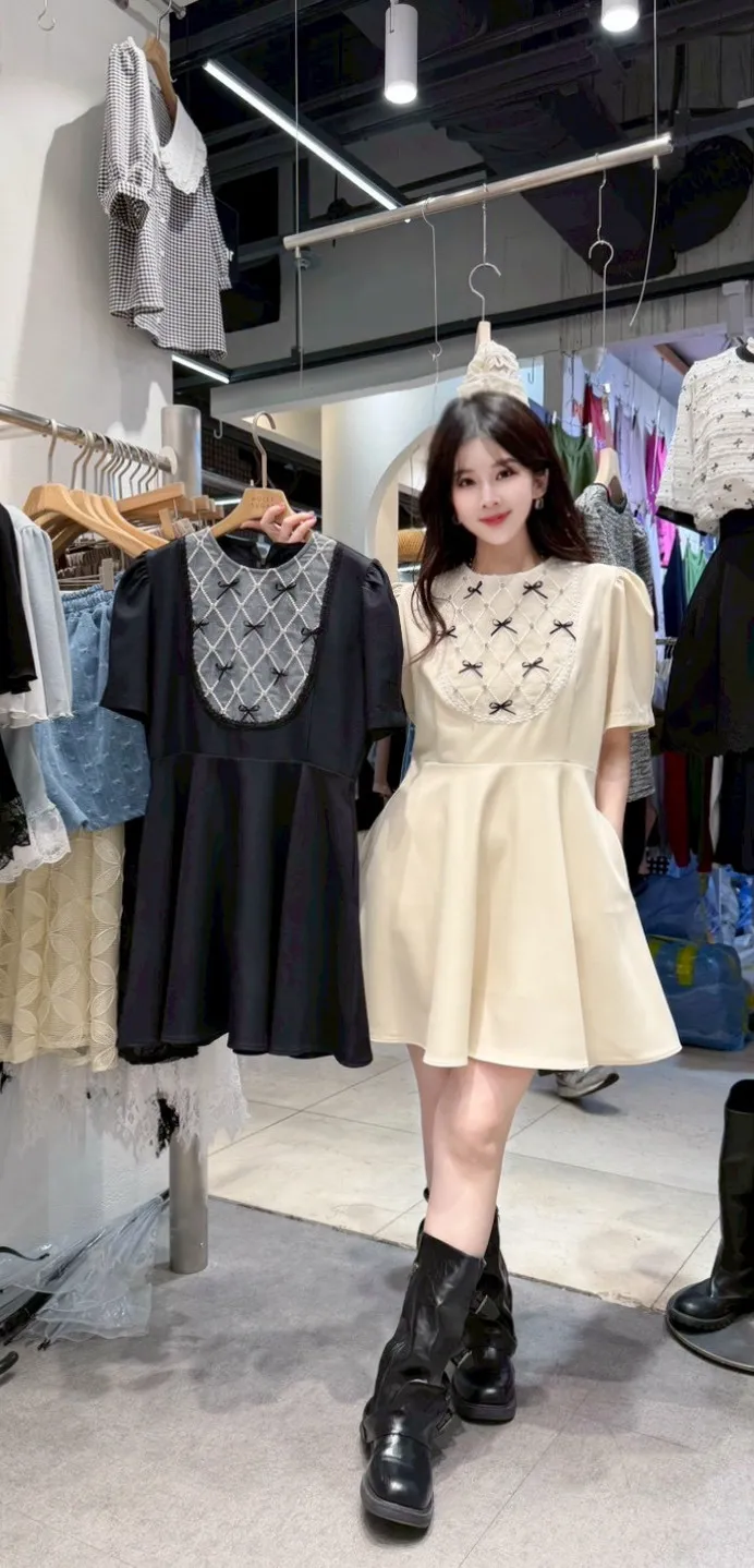 A57 0305OL蕾絲家立體蝴蝶結菱格圓領洋裝2色