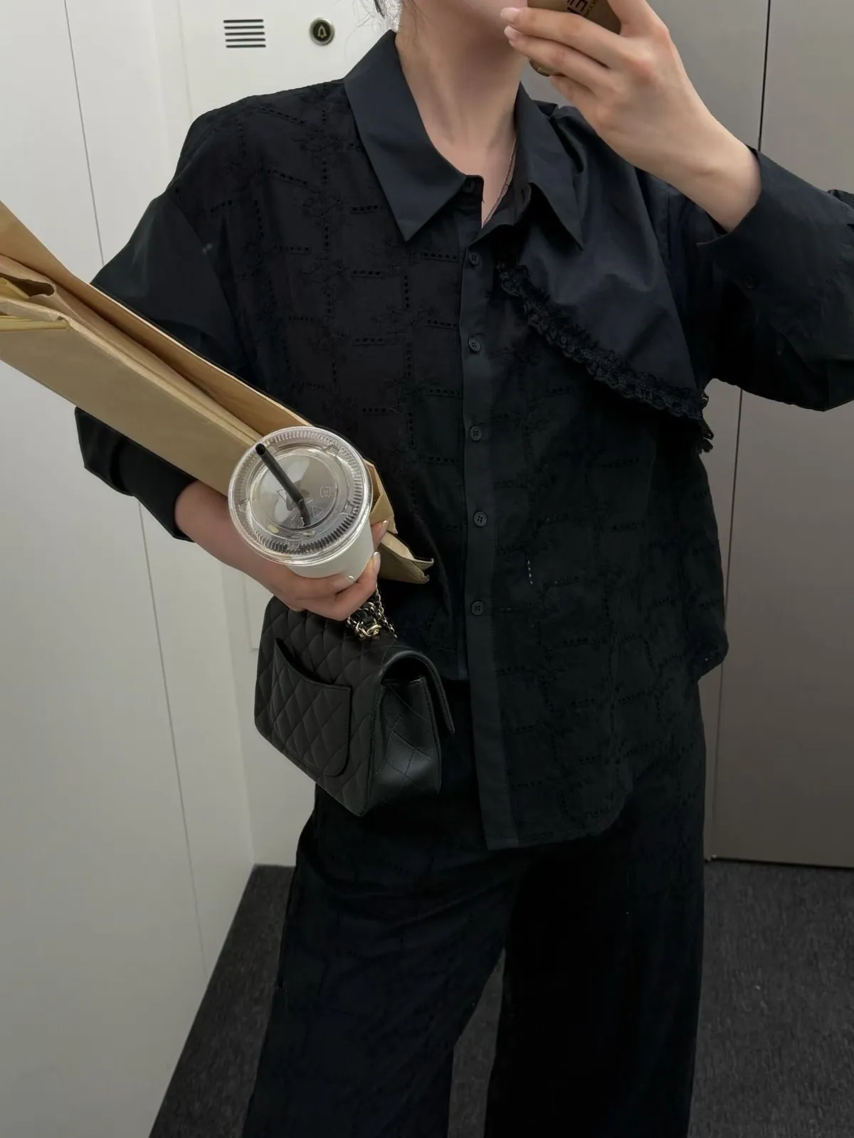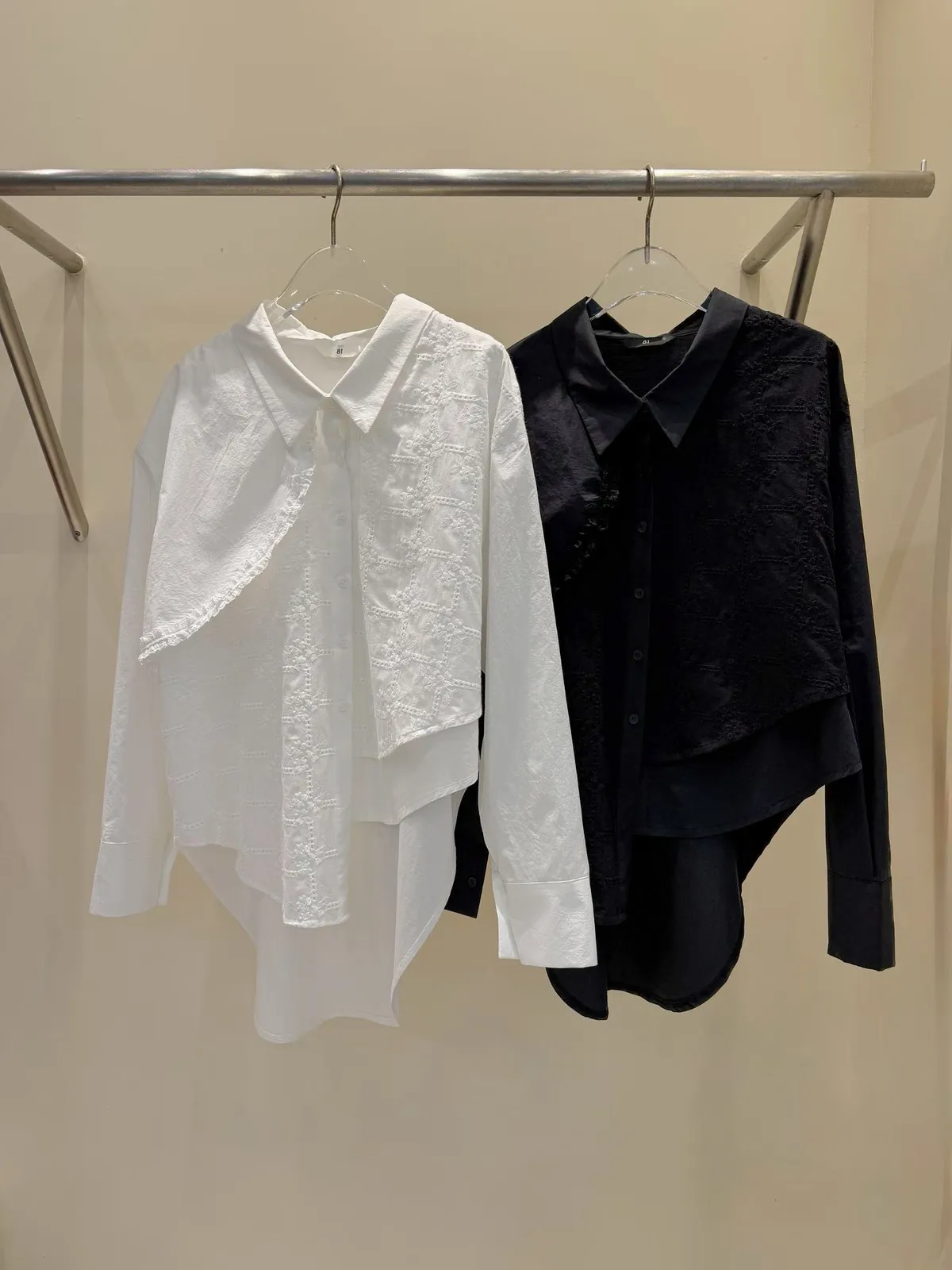 A5 0308網紅歐膩家拼接布蕾絲不對稱襯衫2色