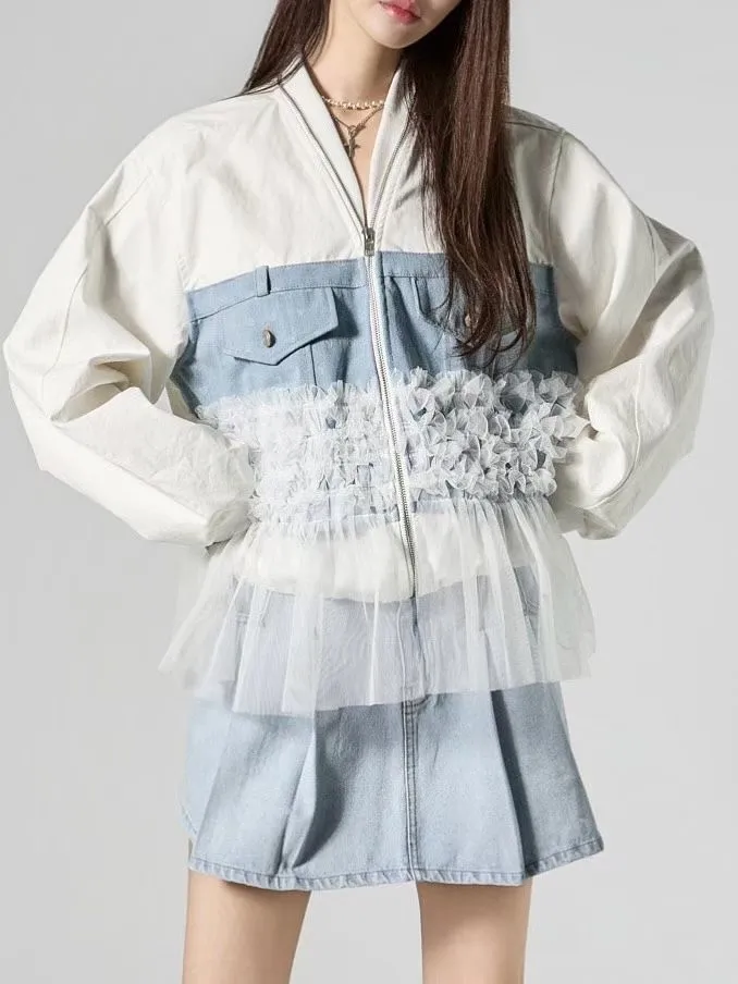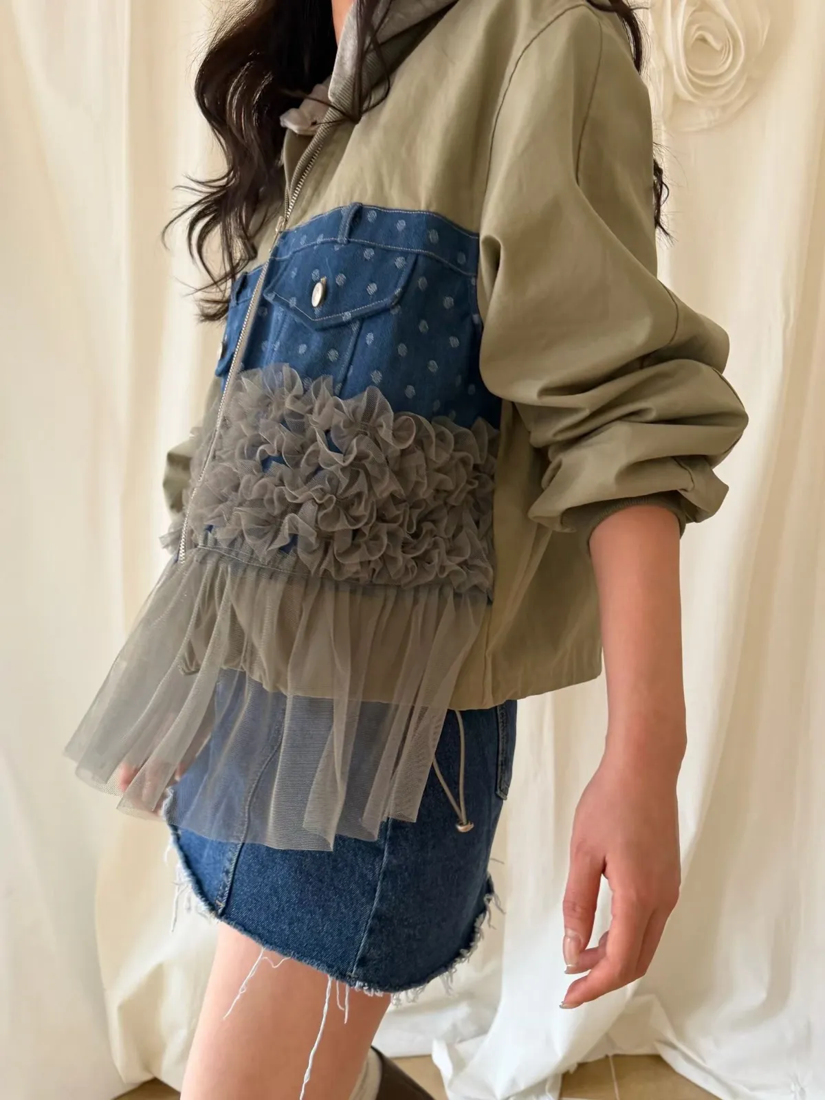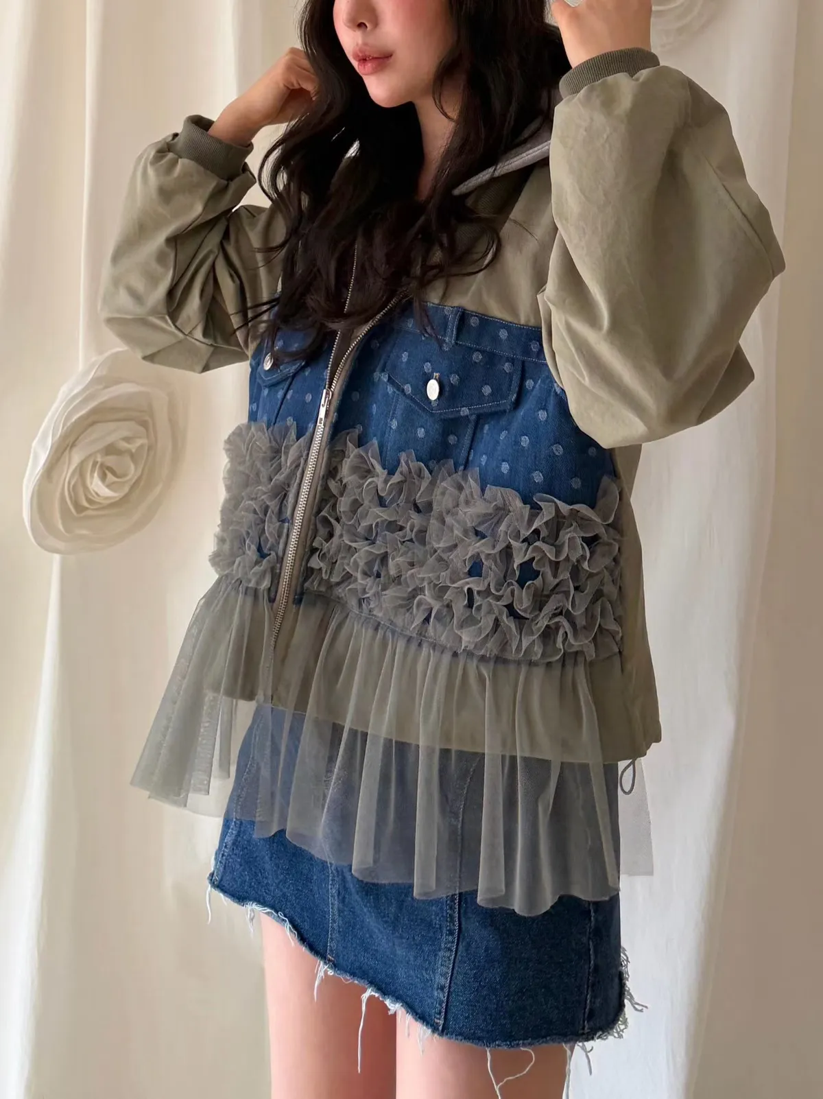 A9 0308網紅歐膩家拼接牛仔網紗連帽風衣外套2色