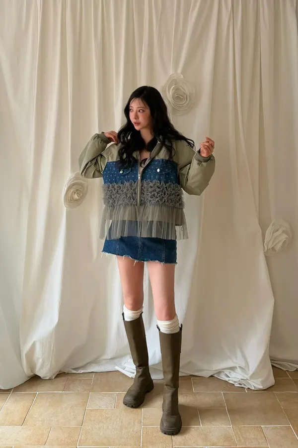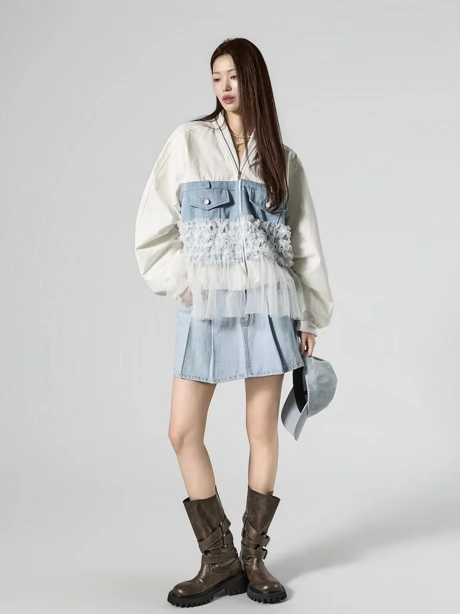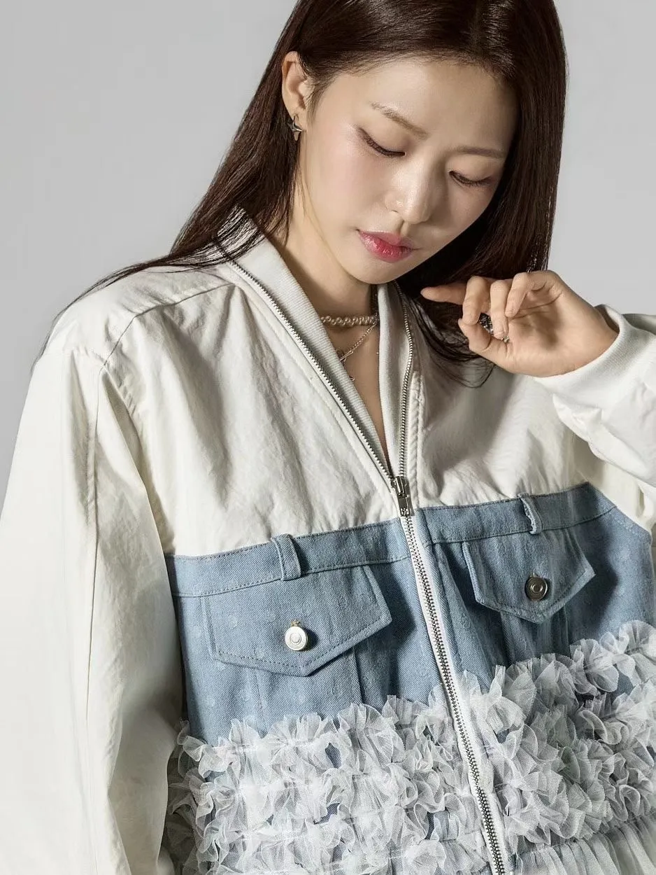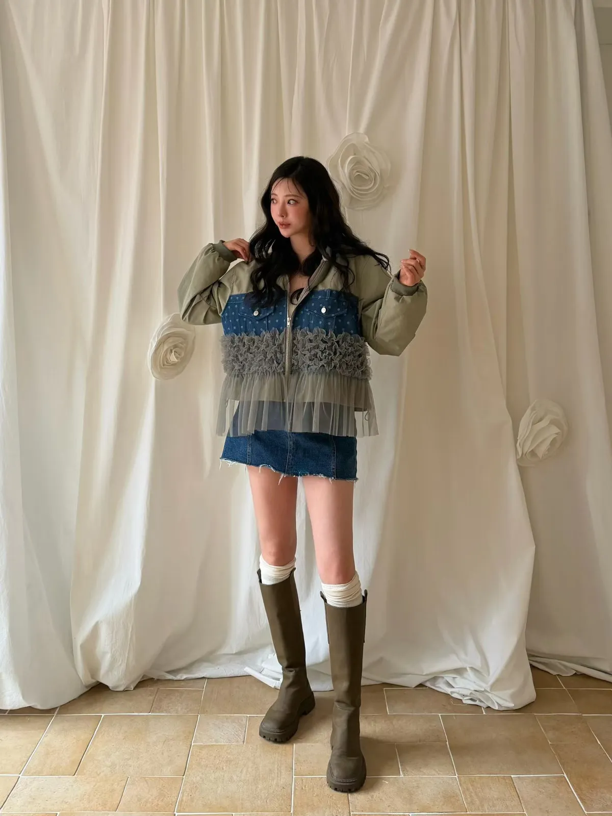 A9 0308網紅歐膩家拼接牛仔網紗連帽風衣外套2色