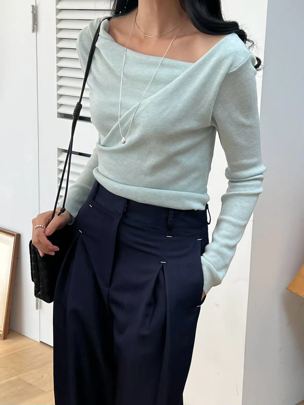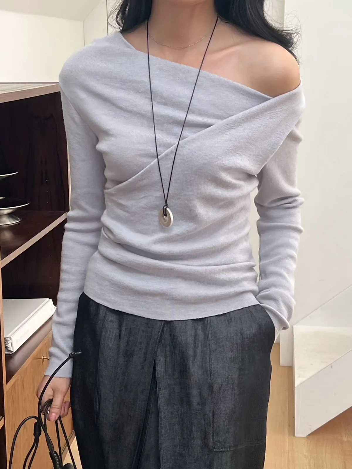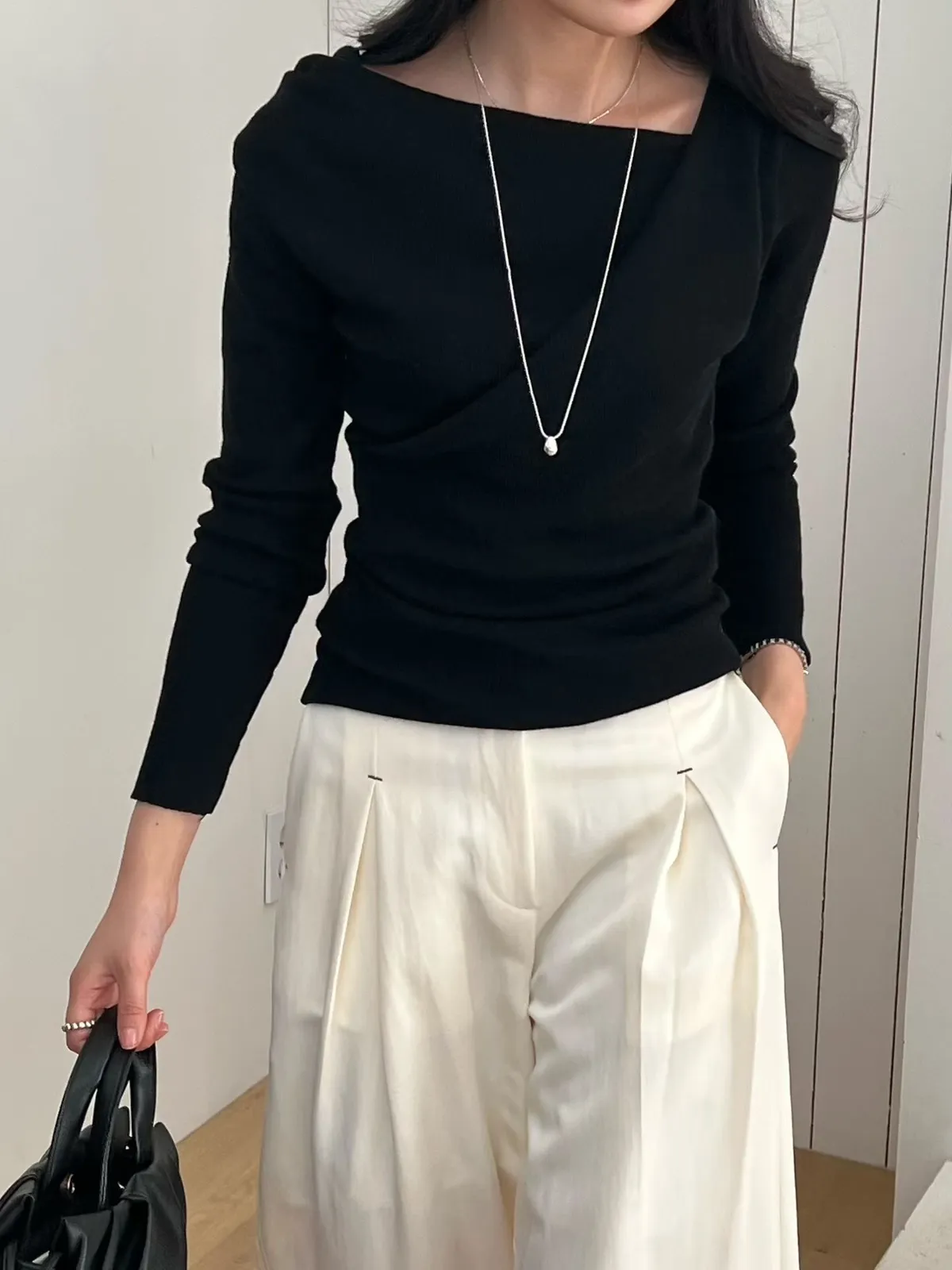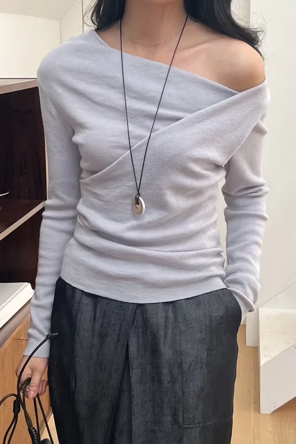 A19 0308高檔名媛家側抓褶垂領可拉一字針織衫4色