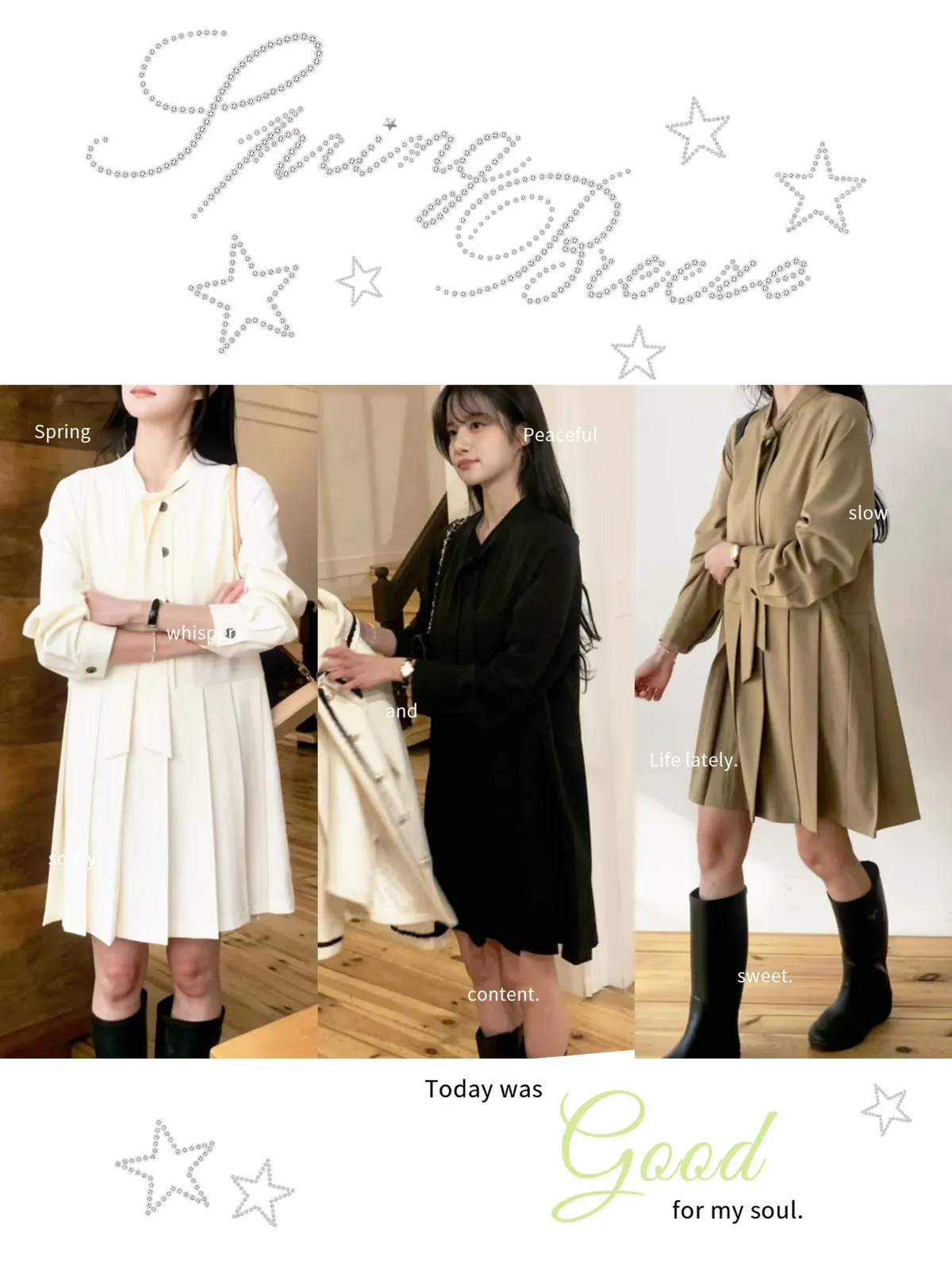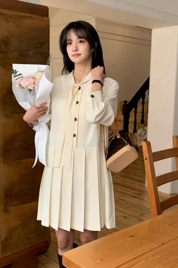 A10 0312高檔小香家綁帶圓領寬百褶裙洋裝3色(現貨白1)