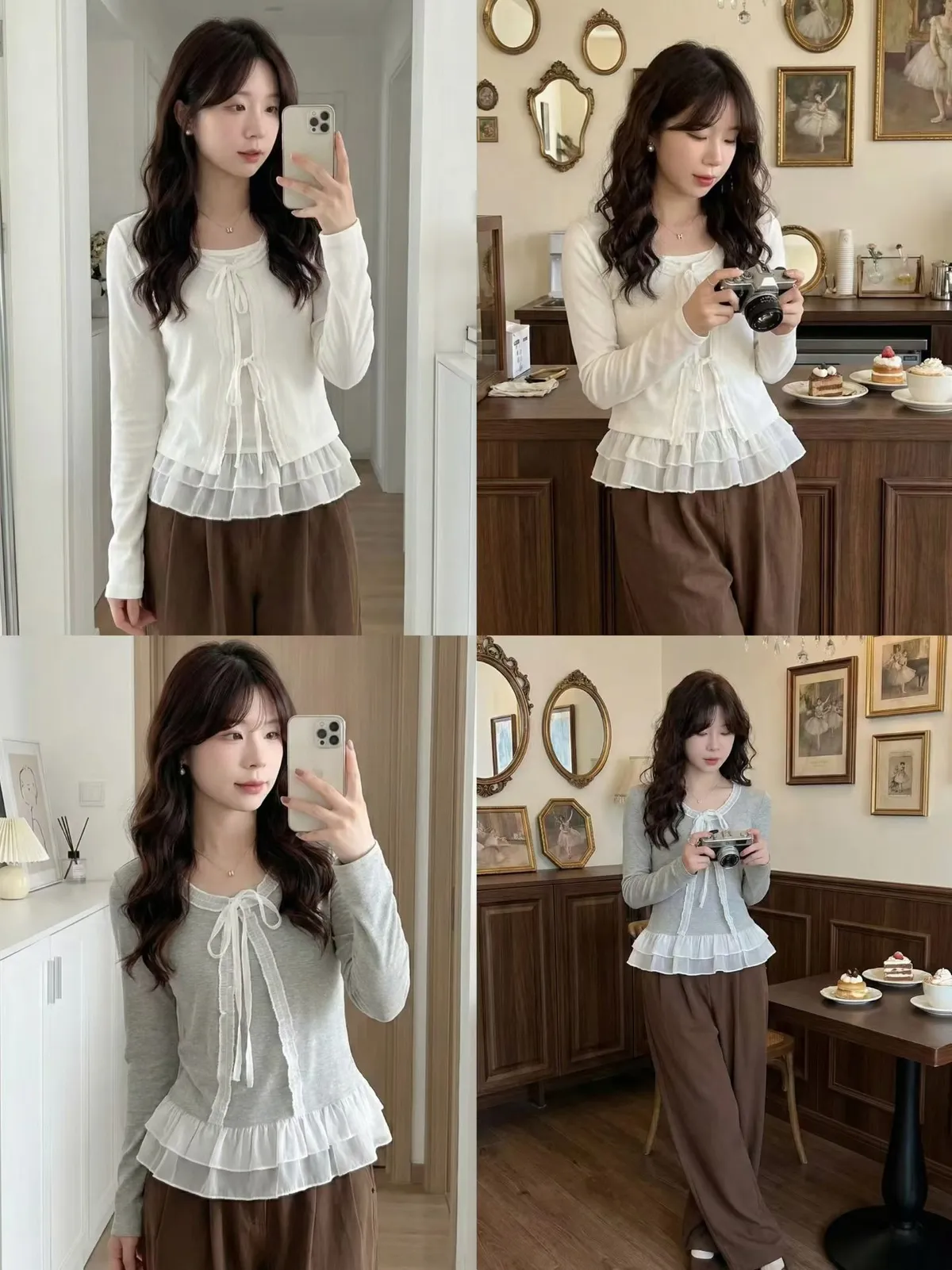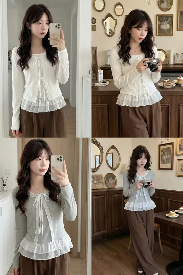 A2 0315假兩件拼接蕾絲綁帶圓領上衣