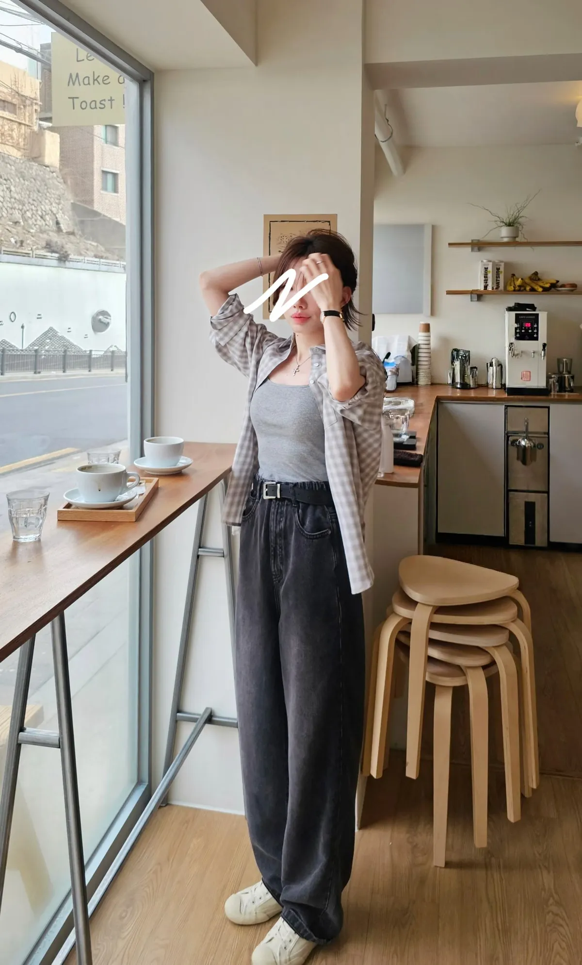 ★搭配:彈力蕾絲打底衫/ 坑條雙肩帶Bratop+韓里韓氣的格紋襯衫