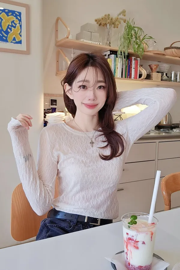B58漂亮歐膩春天的彈力蕾絲打底衫