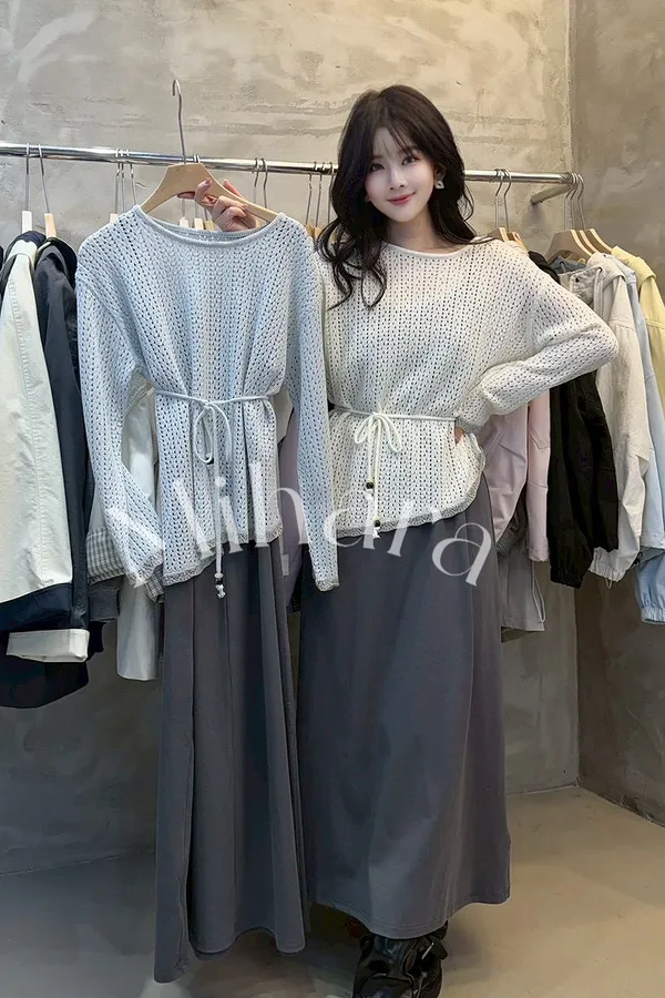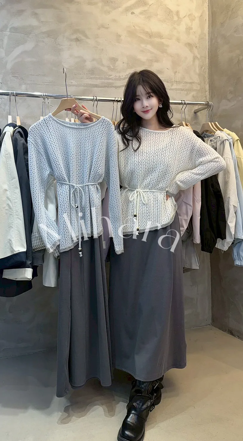 A35 0316高檔W外套家簍空針織綁帶上衣+背心洋(SET)2色