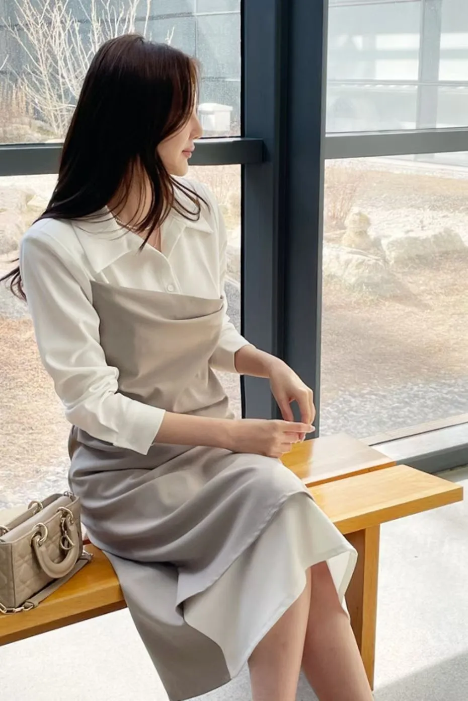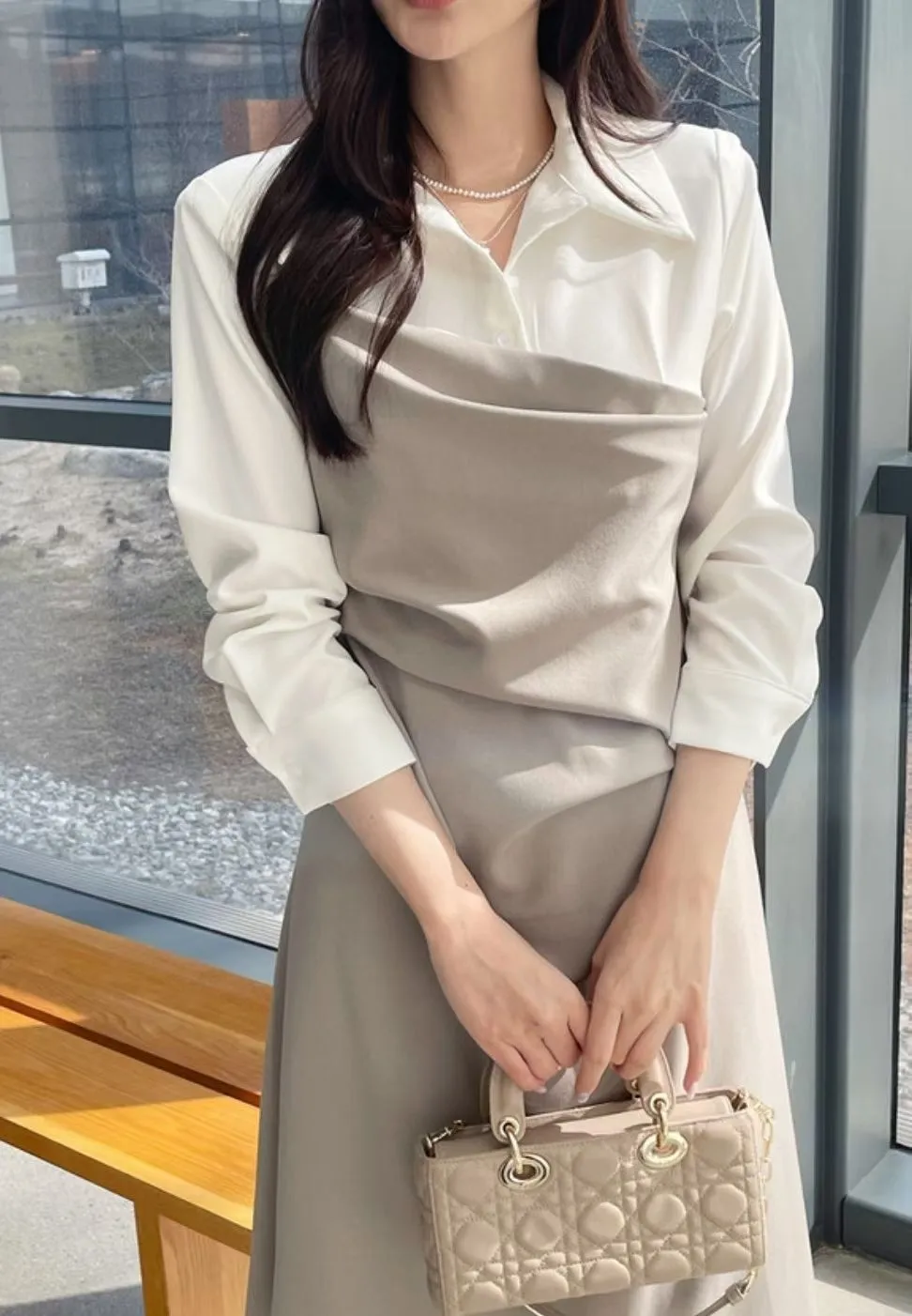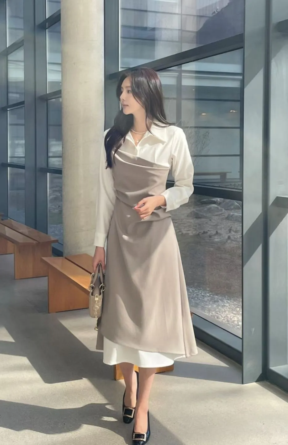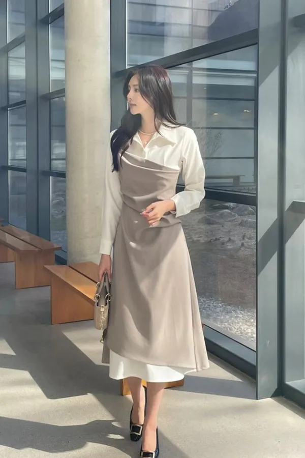 A37 0318翻領假兩件設計洋裝(S/M)