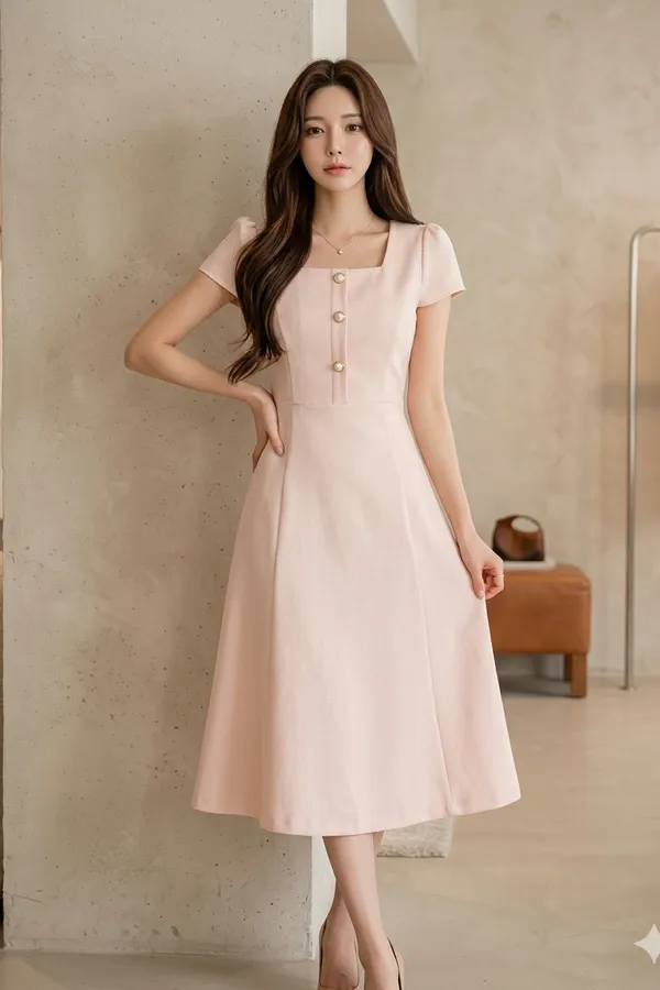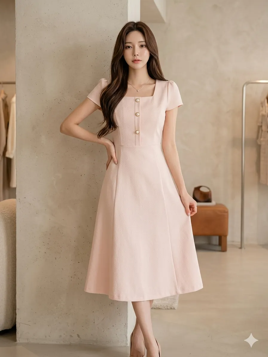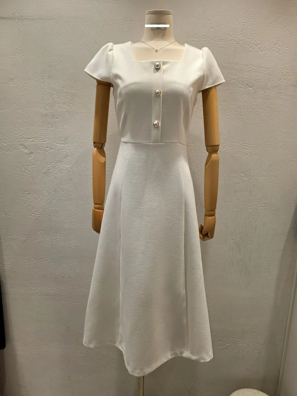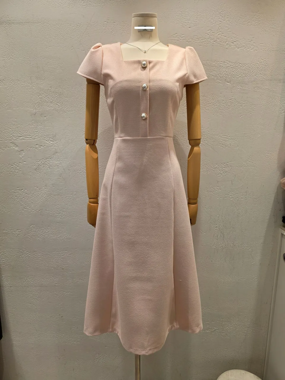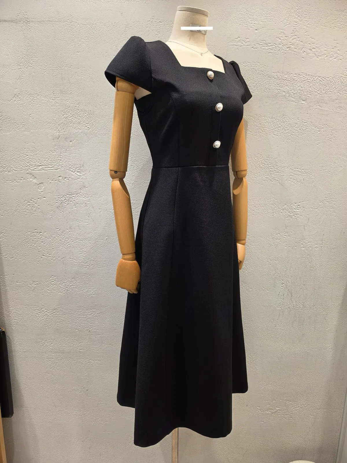 A38 0318名媛氣場方領珍珠釦傘擺洋裝3色