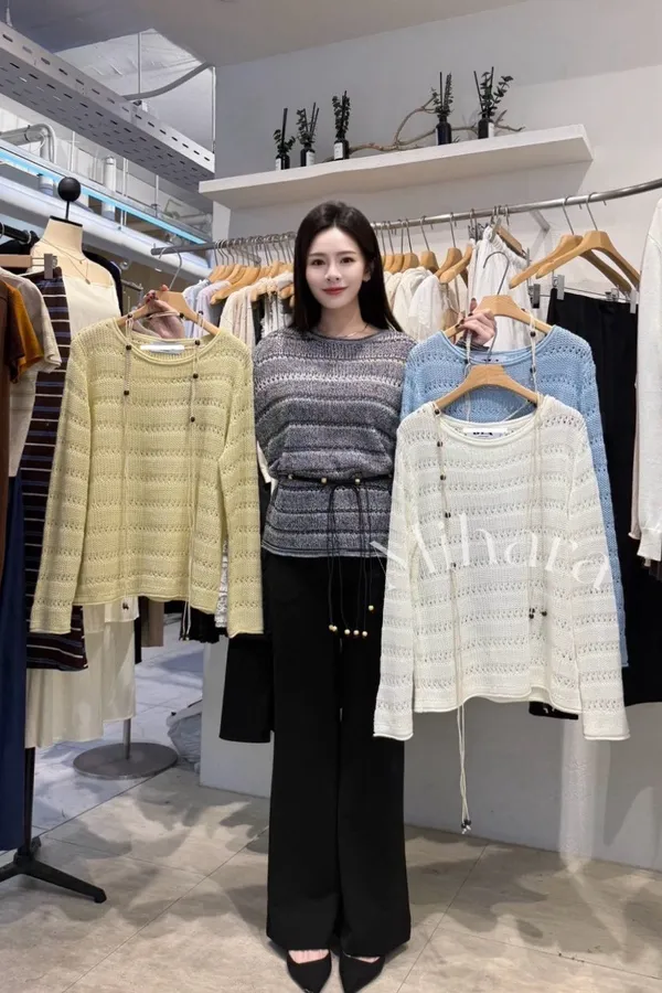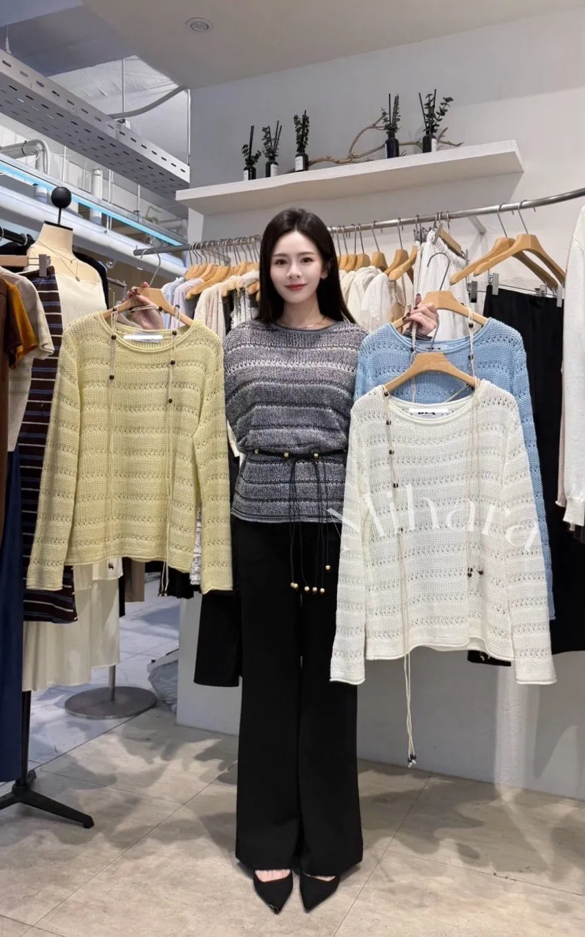 A31 0319許願家橫條圓領針織衫附綁繩4色