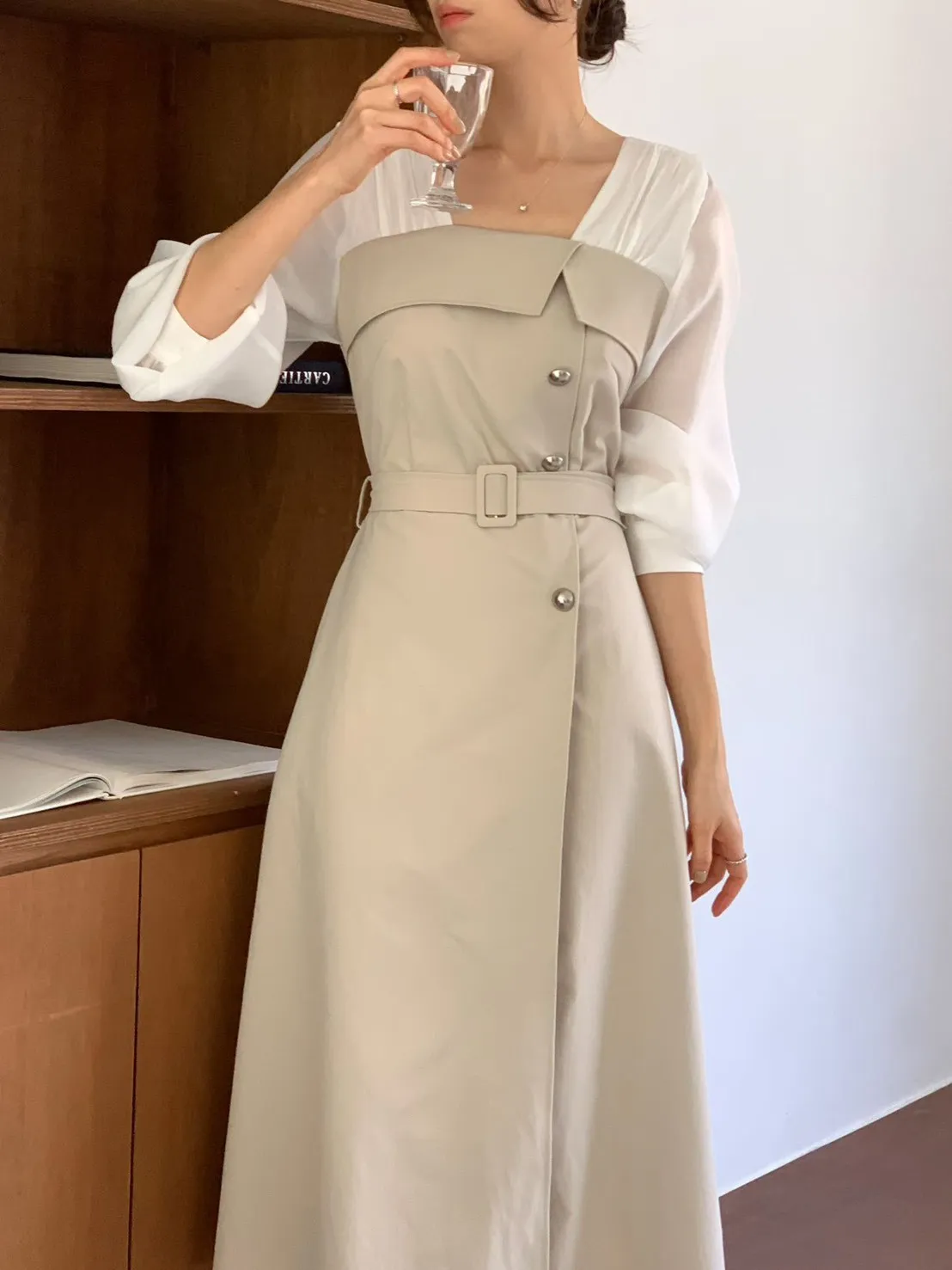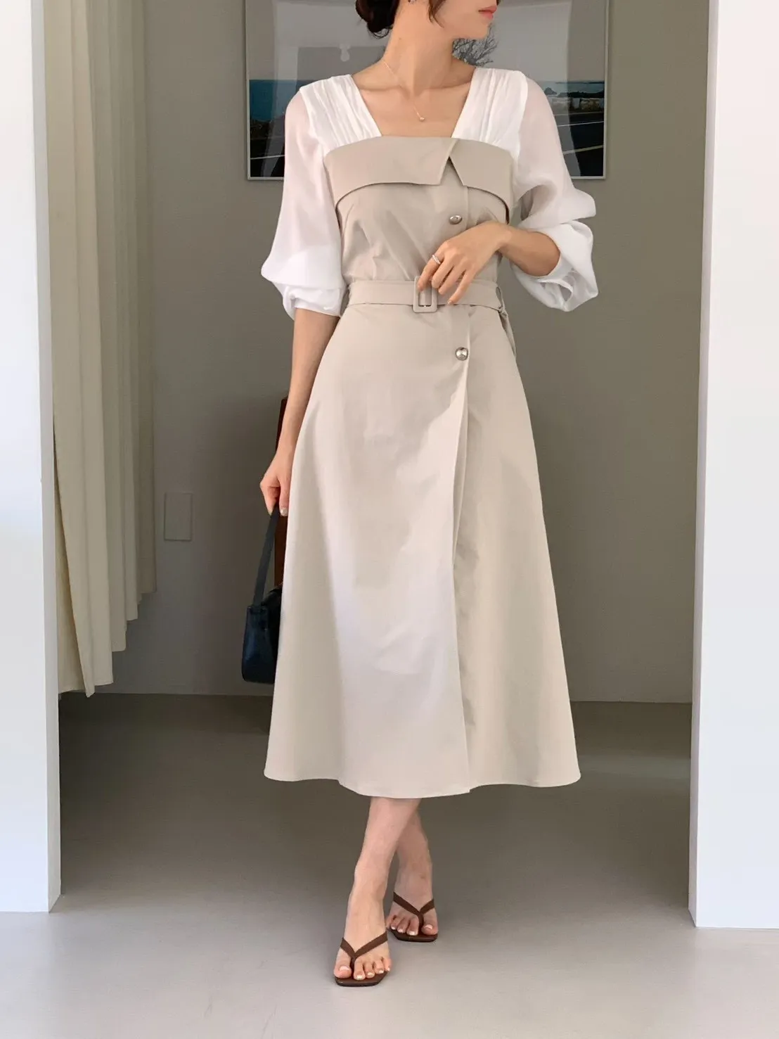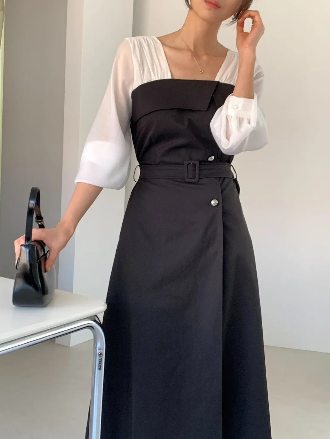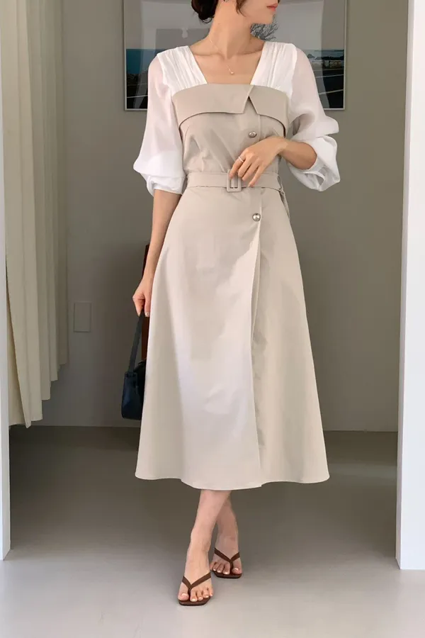 A22 0325優雅拼色腰帶洋裝2色