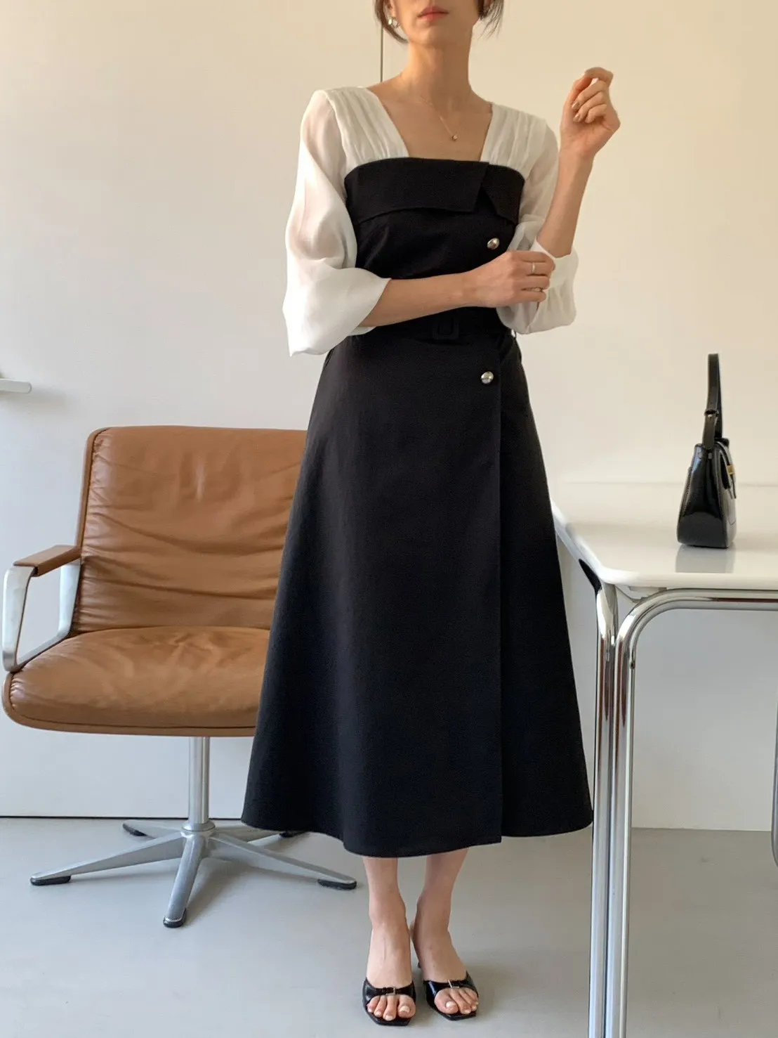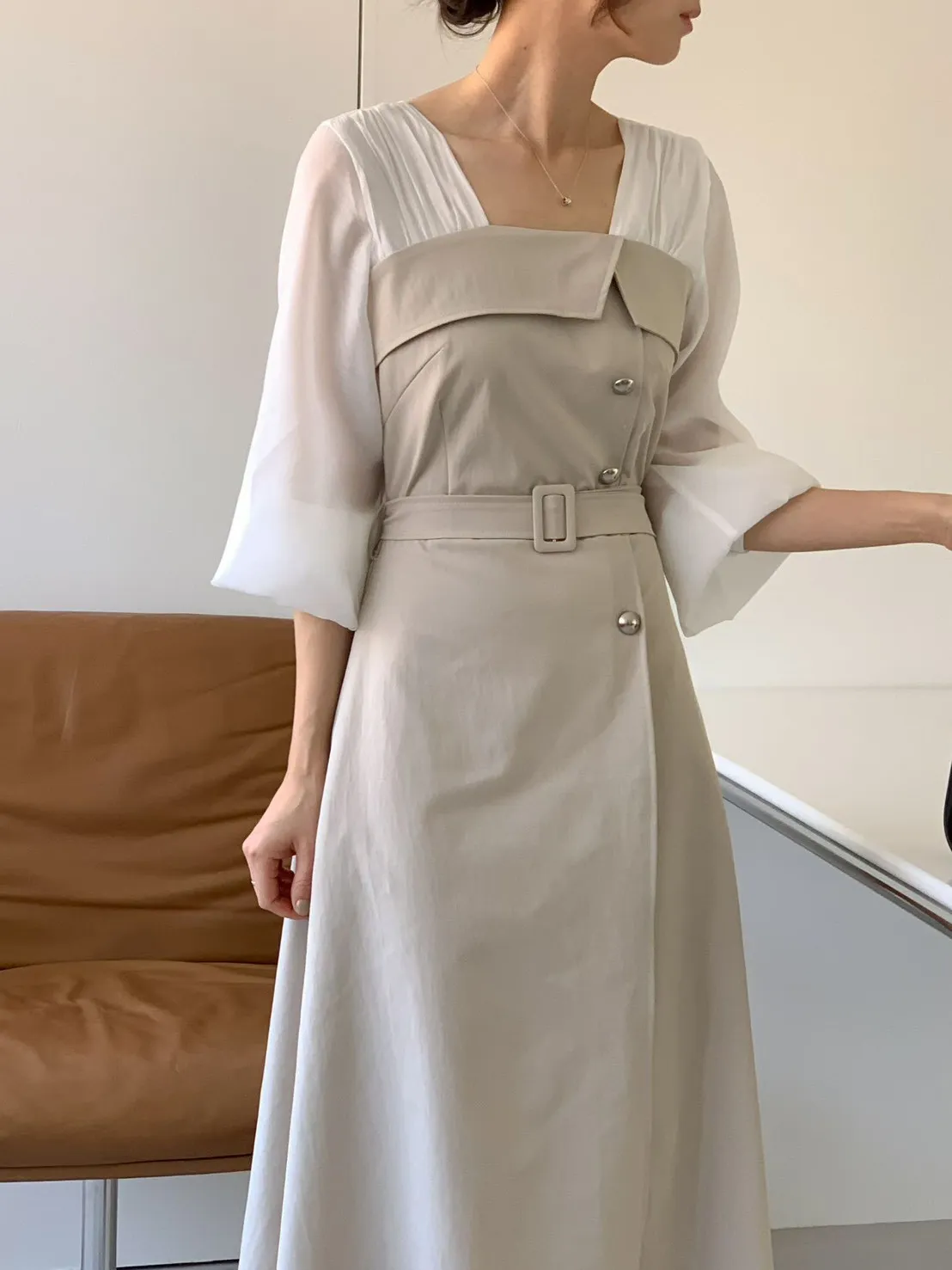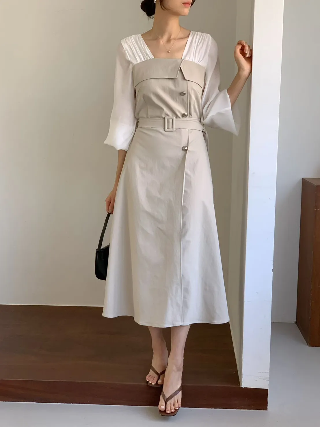 A22 0325優雅拼色腰帶洋裝2色