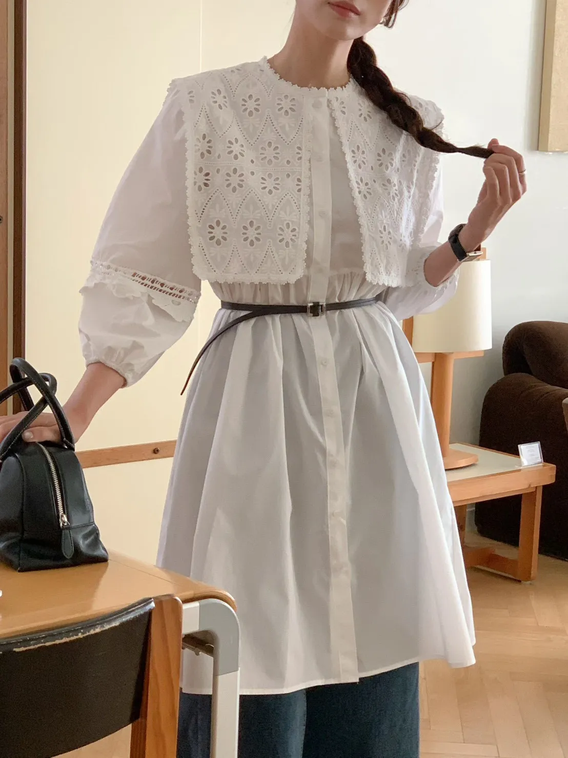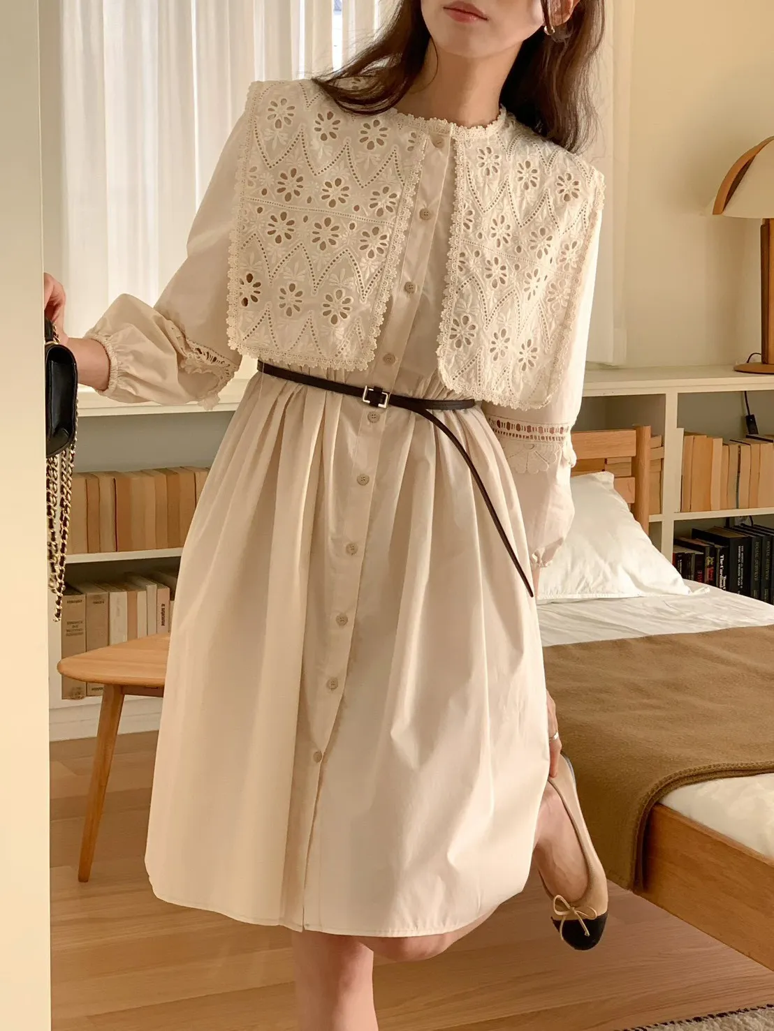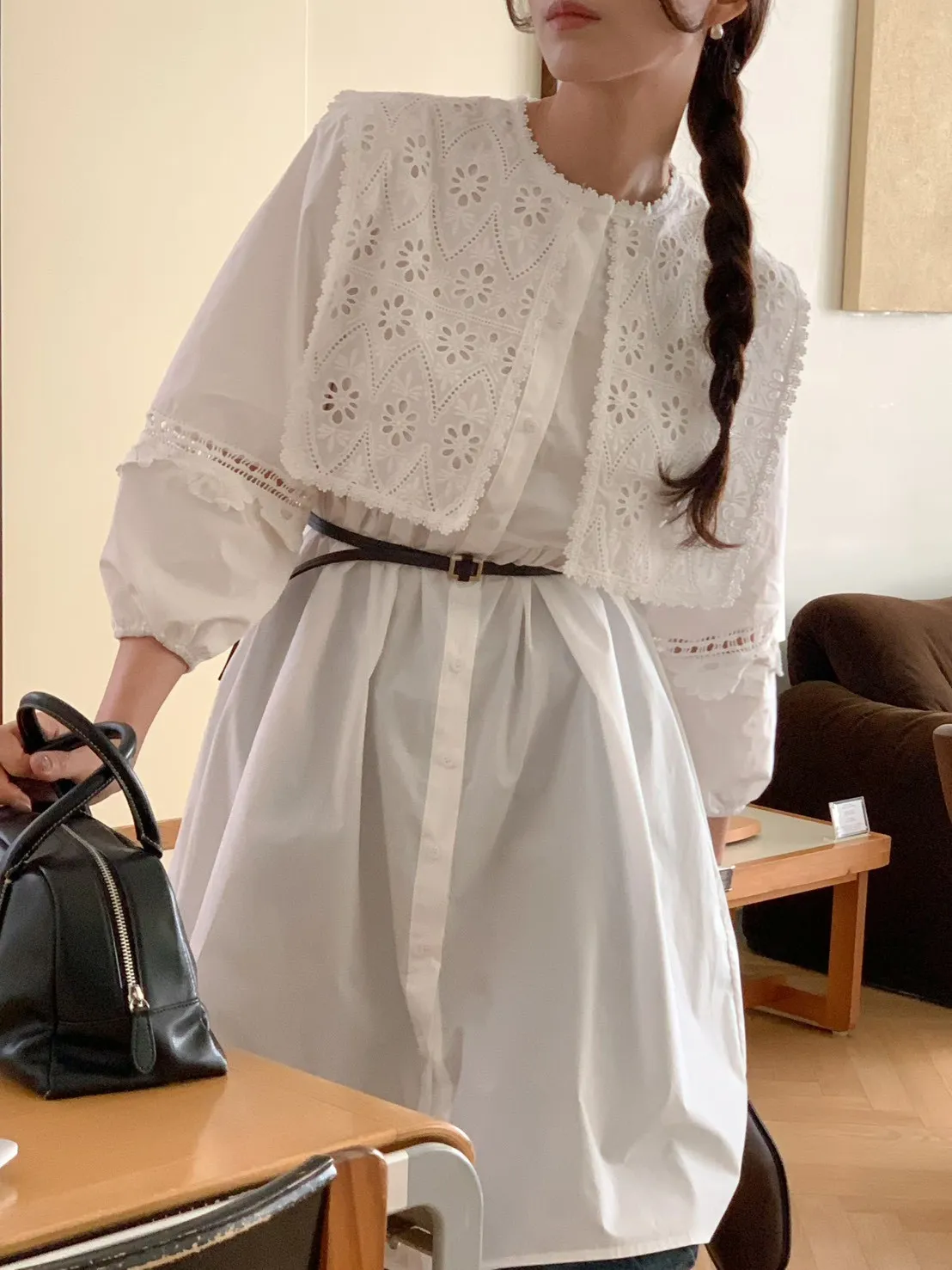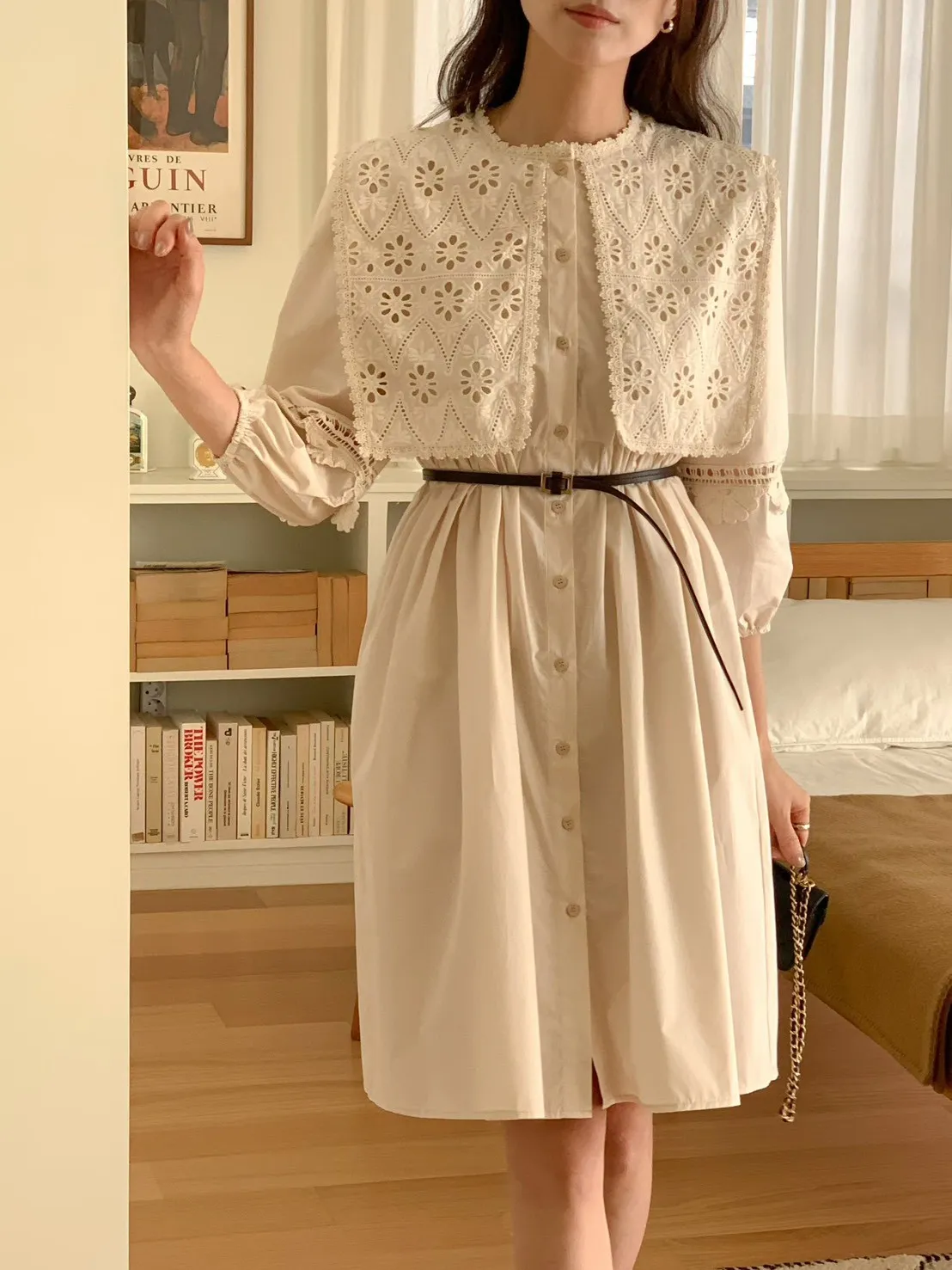 A23 0325大領子布蕾絲燒花開釦洋裝2色