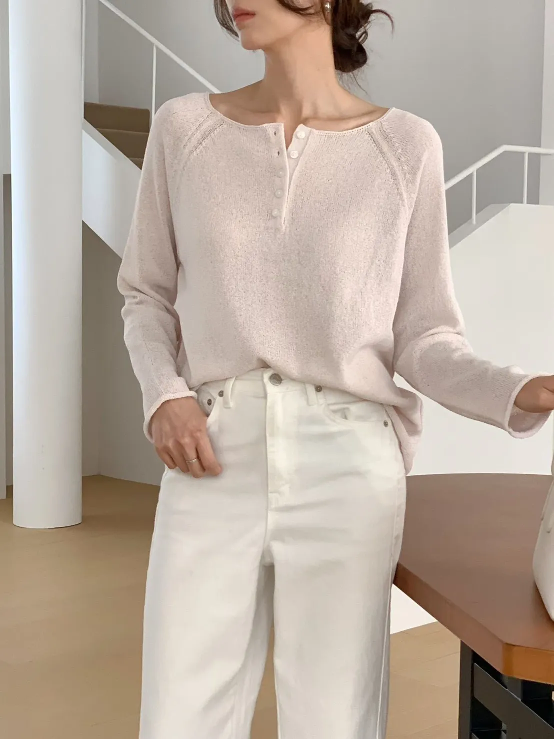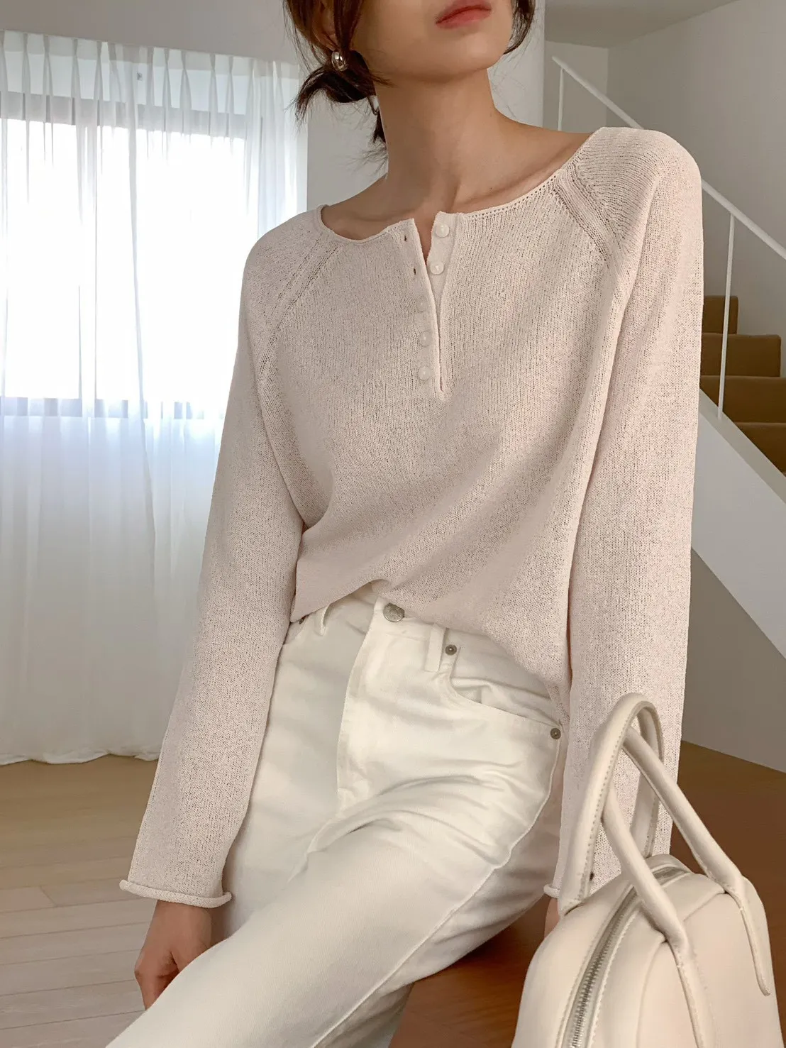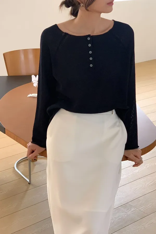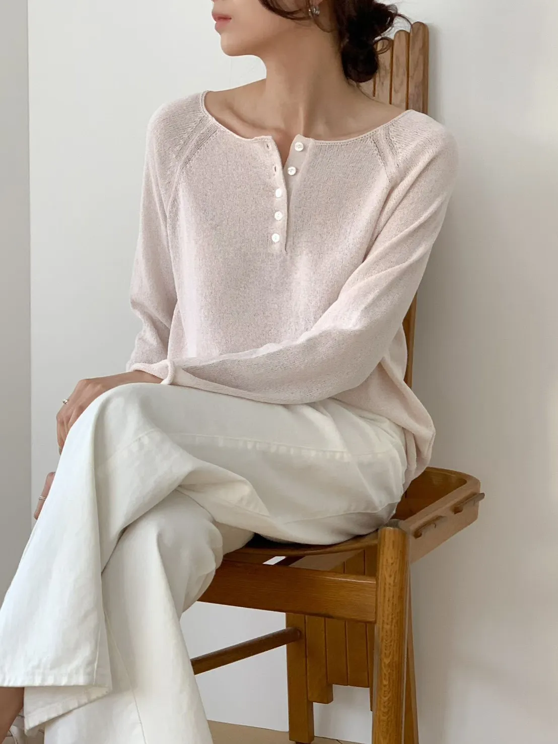 A28 0325寬領開釦亞麻薄針織上衣3色