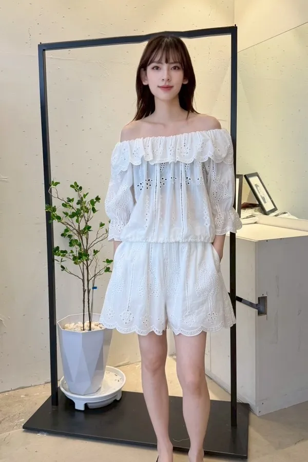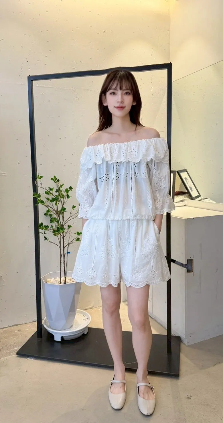 A48 0325CP家雕花布蕾絲一字上衣+短褲(SET)