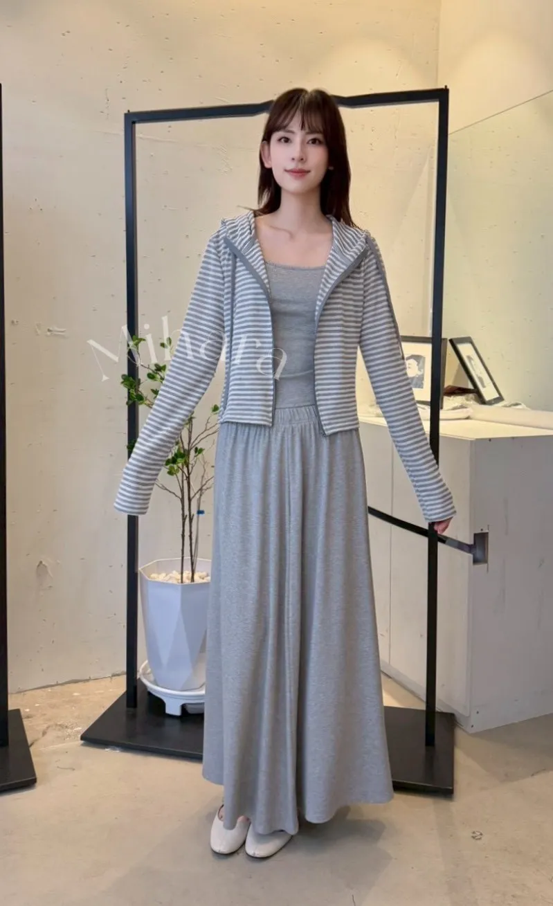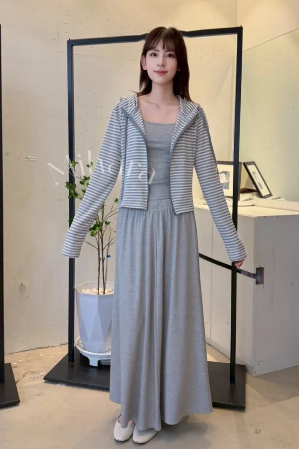 A59 0325CP家橫條連帽外套+細肩帶背心+半裙(SET)