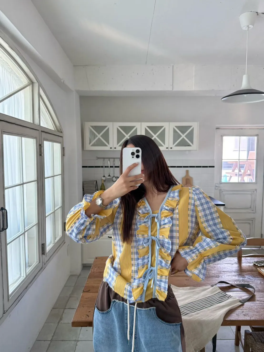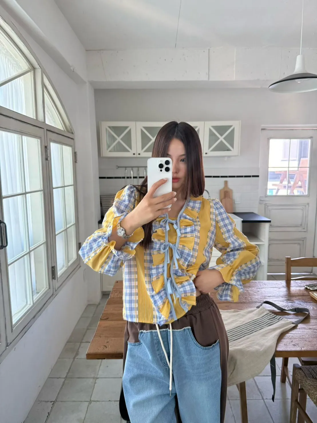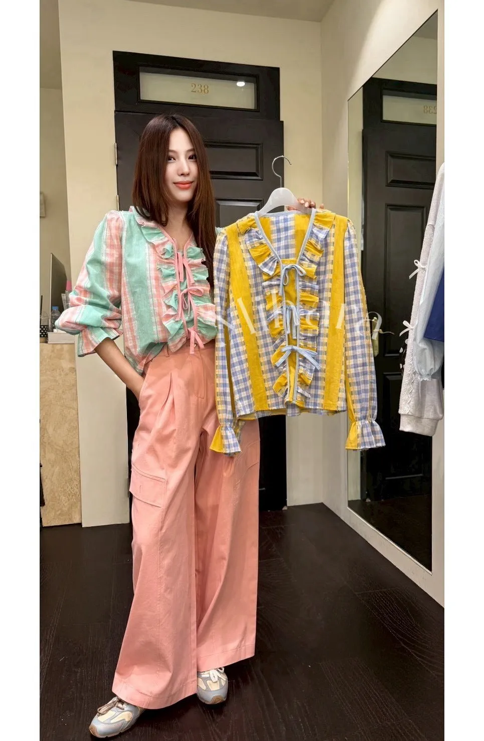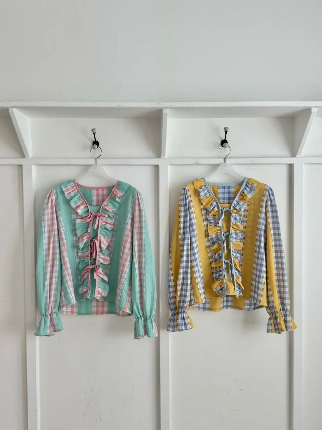 A21 0326素希歐膩家格紋綁帶棉麻襯衫2色