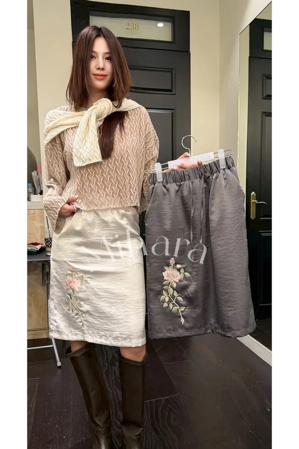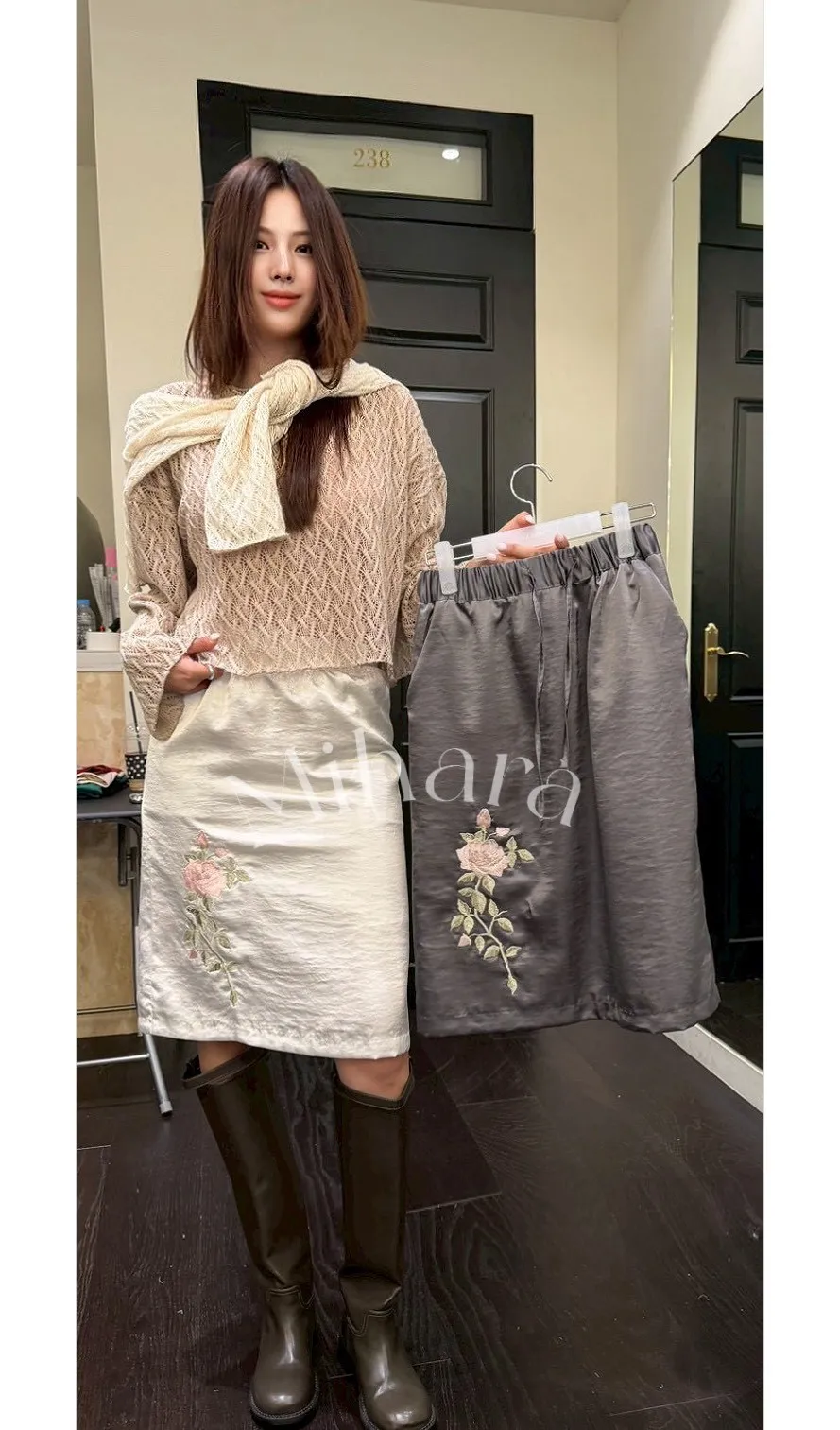 A24 0326素希歐膩家花朵刺繡後開衩半裙2色
