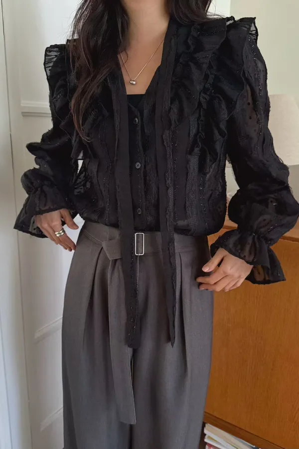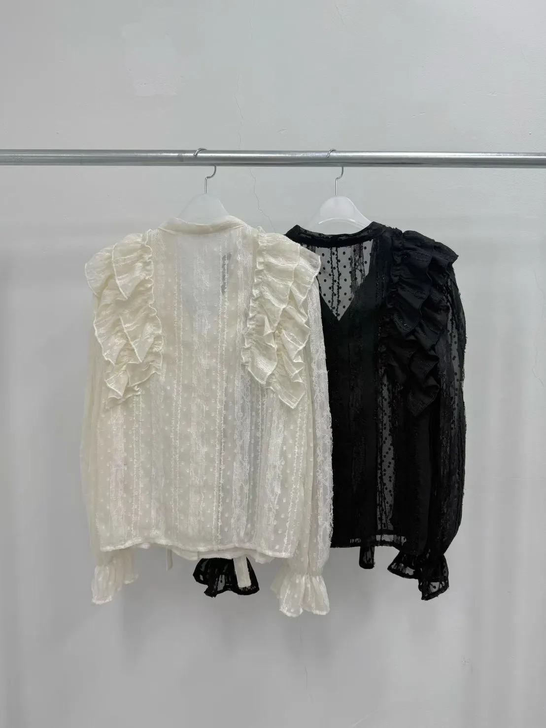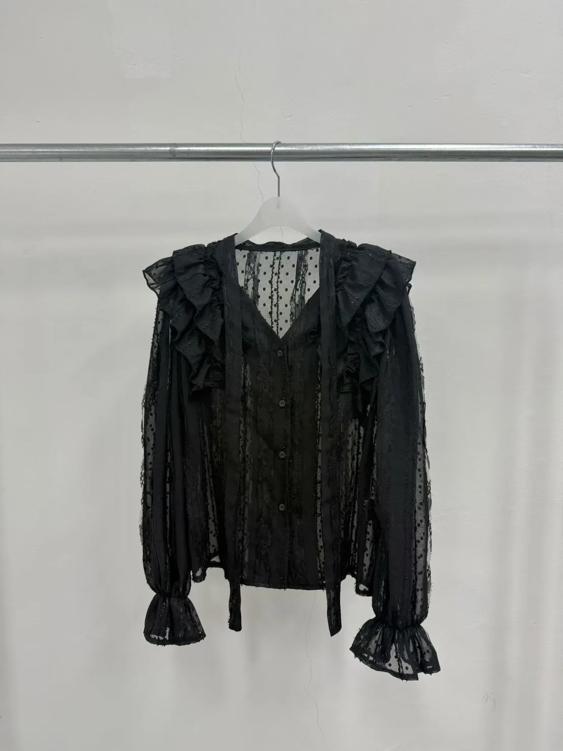 A35 0326素希歐膩家點點蕾絲綁帶V領雪紡襯衫2色